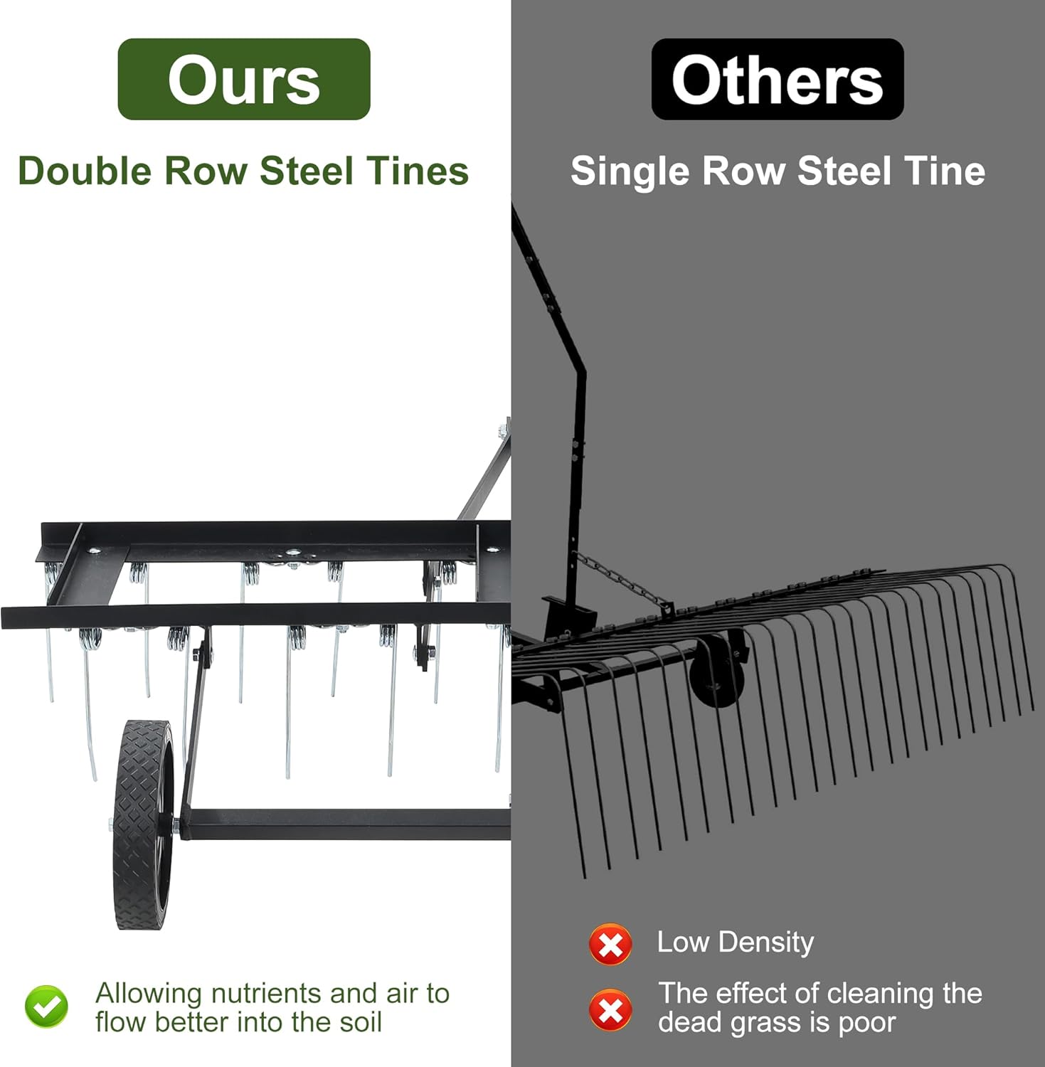 - Dual-Row Steel Tines for Deep Cleaning:Equipped with 2 rows of 20 flexible steel tines, this lawn dethatcher effectively removes matted grass and thatch from the root level, allowing your lawn to breathe freely. The cleverly designed tines loosen and lift the thatch, creating optimal conditions for healthier lawn growth, promoting lush, green, and vibrant grass.