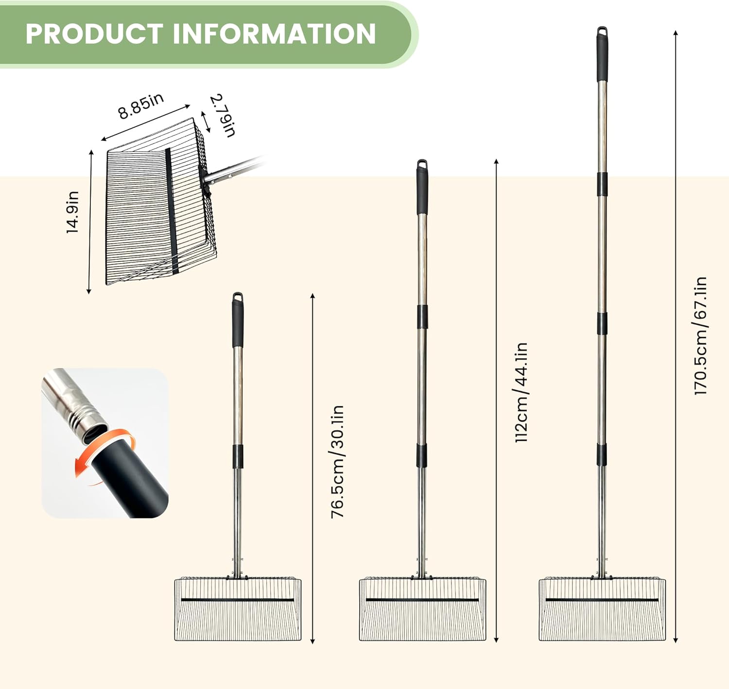 - ✅ 3-section telescoping handle (30-67 inches) for coop scoop: Adjusts to multiple lengths to reach tight coop corners, deep piles, or high areas—this coop scoop reduces bending, eases back strain, and cuts down cleaning time significantly. Made of rust-resistant stainless steel, ensuring the chicken coop scoop stays sturdy enough for daily use even with frequent handling. This chicken poop scooper is perfect for home chicken keepers or small-scale farmers, and no more sore backs from hunching over when using the chicken scooper for poop!