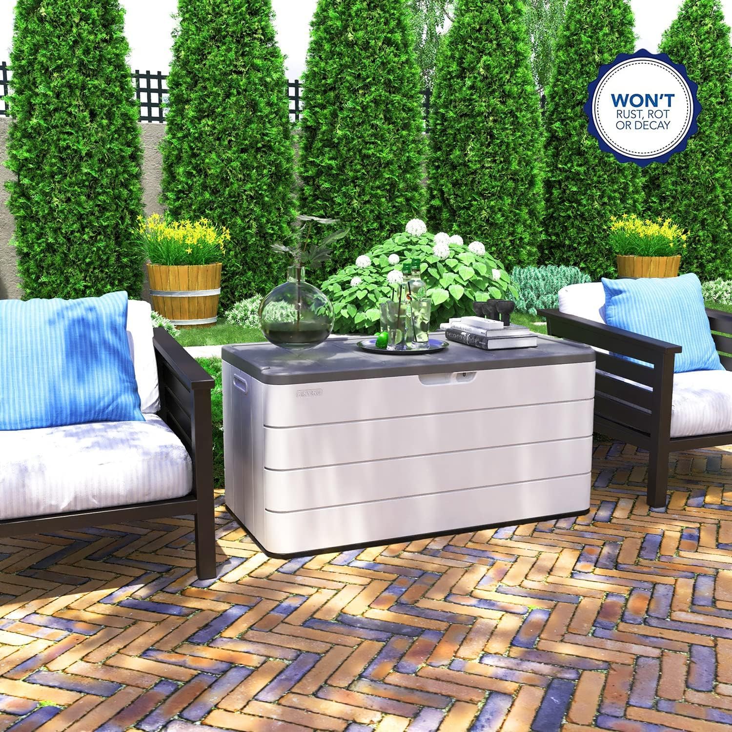 - ă100 Gallon Large Capacityă Spacious 100 GAL interior stores patio cushions, garden tools, pool floats, and outdoor toys. Doubles as a storage ottoman, side table, or bench for deck, patio, and backyard spaces.