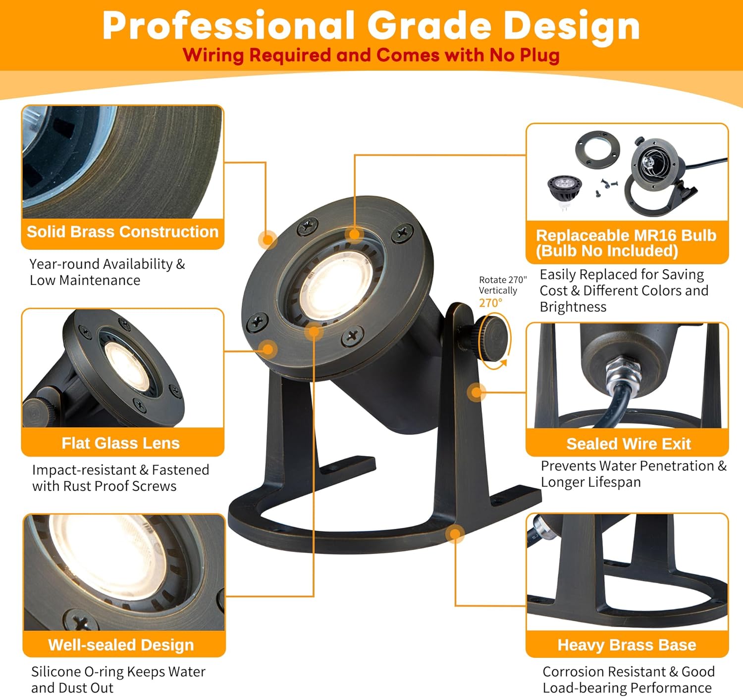 - ๐๐๐๐ ๐๐๐ญ๐๐ซ๐ฉ๐ซ๐จ๐จ๐: Underwater lights are made of waterproof heavy-duty brass with thick glass lenses and sturdy silicone gaskets for a perfect seal. These wired low voltage pond lights ensure stable and long-lasting illumination and work perfectly in any weather