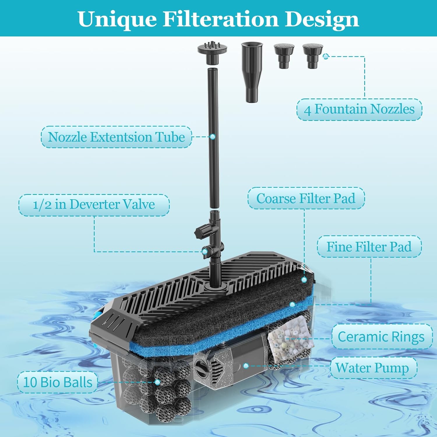 - 【Multiple Protections】The water pump features with water shortage protection that will shut off when the water level is below the dry-run prable to protects the motor. The filter sponges and bio-balls will make a double filter area per unit volume, and bio ceramic rings for increased filtration, which help reduce maintenance and improve water clarity in koi pond.