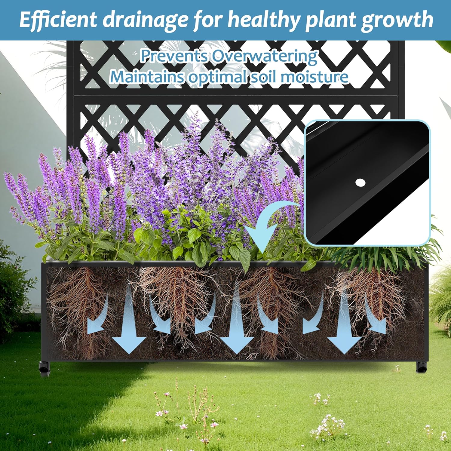 Metal Planter Box with Trellis & Wheels, Raised Garden Bed with Privacy Screen, Outdoor Standing Flower Beds with Drainage Hole for Climbing Plants, Vine, 47.2''L×15.7''W×70.9''H, Black
