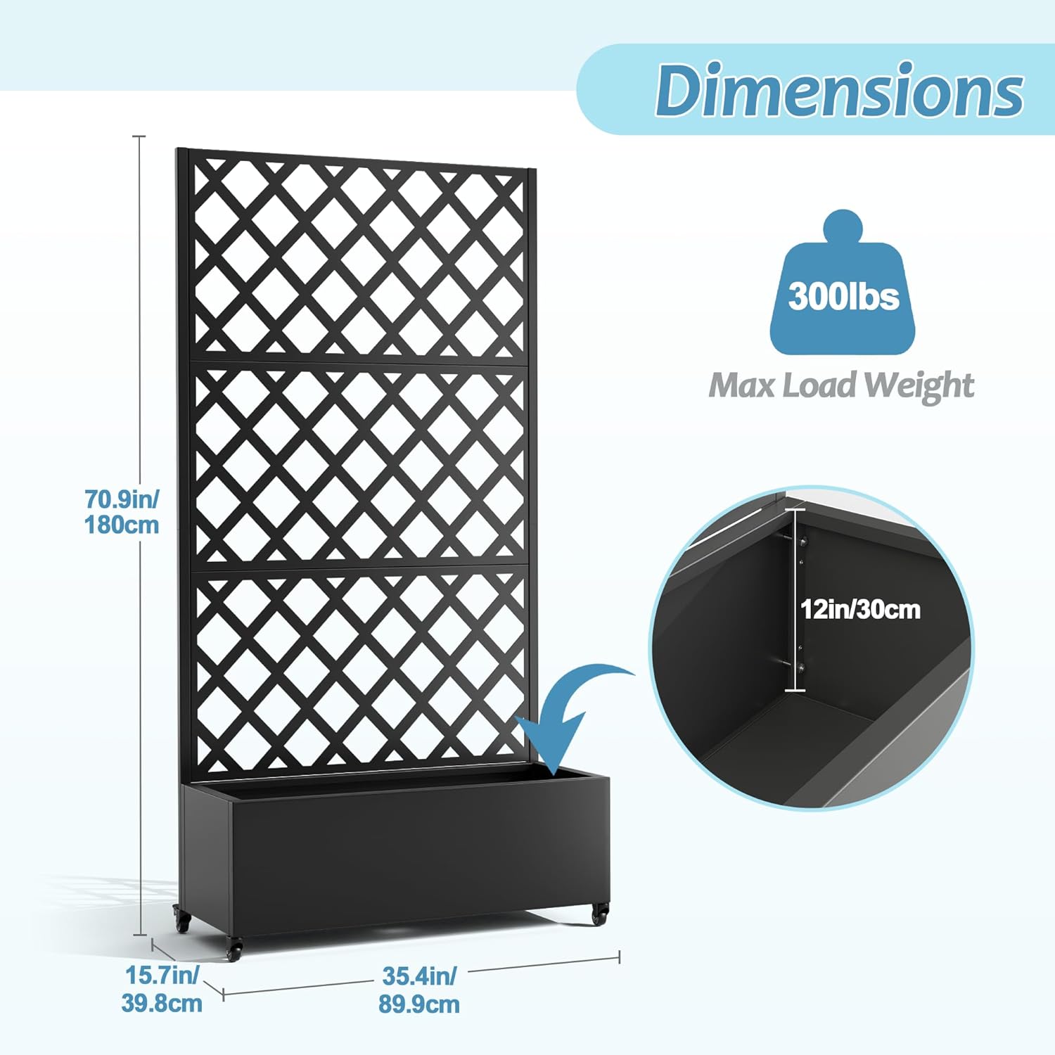 Metal Planter Box with Trellis & Wheels, Raised Garden Bed with Privacy Screen, Outdoor Standing Flower Beds with Drainage Hole for Climbing Plants, Vine, 35.4" L x 15.7" W x 70.9" H, Black