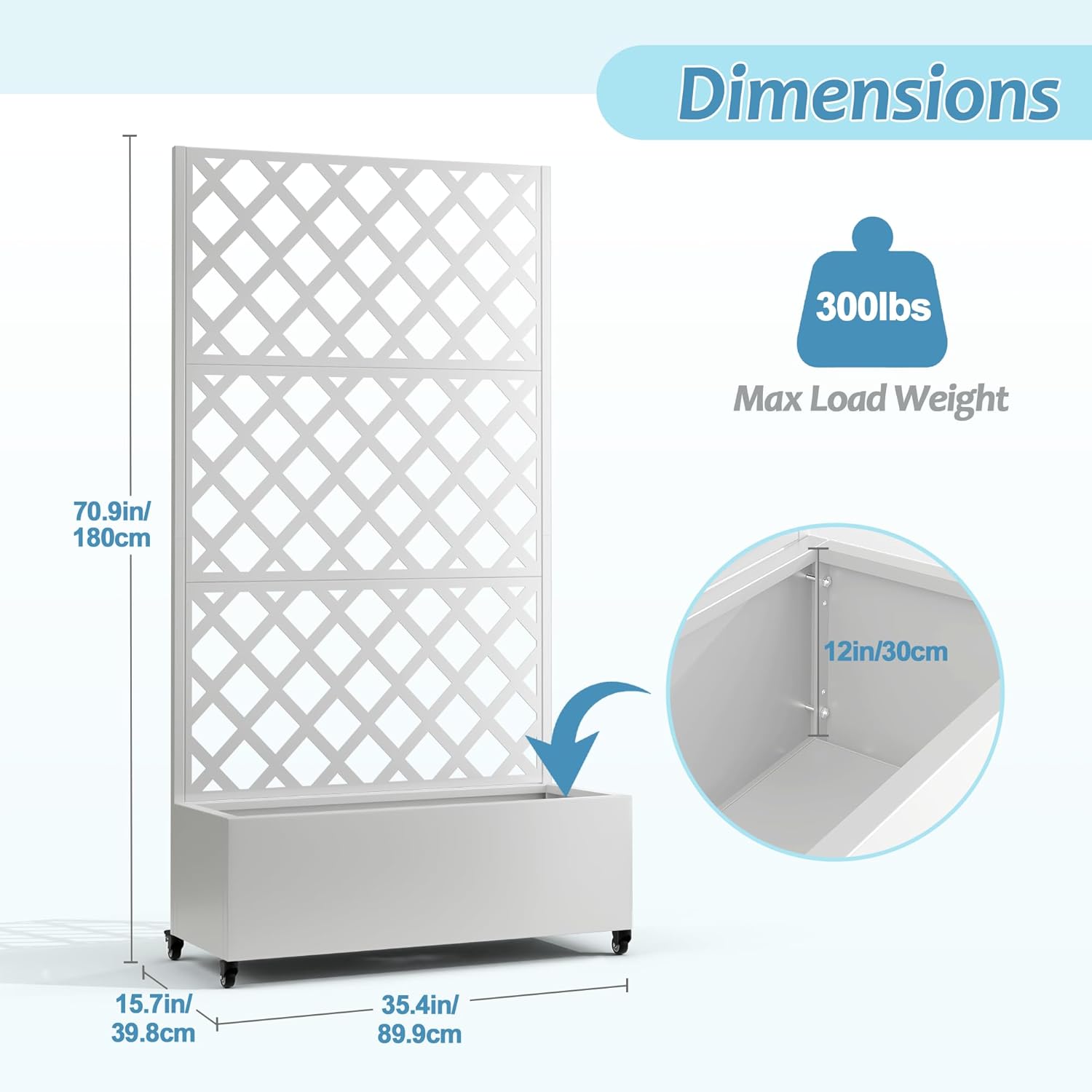 Metal Planter Box with Trellis & Wheels, Raised Garden Bed with Privacy Screen, Outdoor Standing Flower Beds with Drainage Hole for Climbing Plants, Vine, 35.4" L x 15.7" W x 70.9" H, White