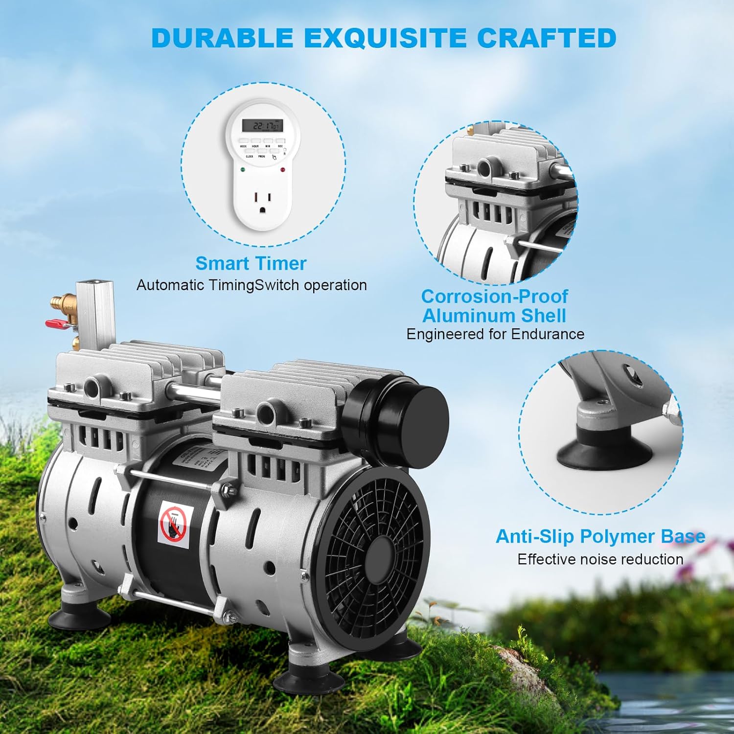 - Powerful Yet Whisper-Quiet 60dB:Efficiently aerate ponds or lakes up to 3 acres and 70 feet deep. Features a robust 550W (3/4 HP) pure copper motor for longevity, while our integrated silencer ensures exceptionally quiet outdoor pond aerator operation – just 60dB