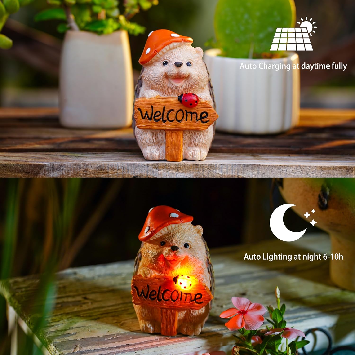 - WHIMSICAL DESIGN: Adorable hedgehog statue wearing a spotted orange mushroom cap hat while holding a rustic wooden welcome sign