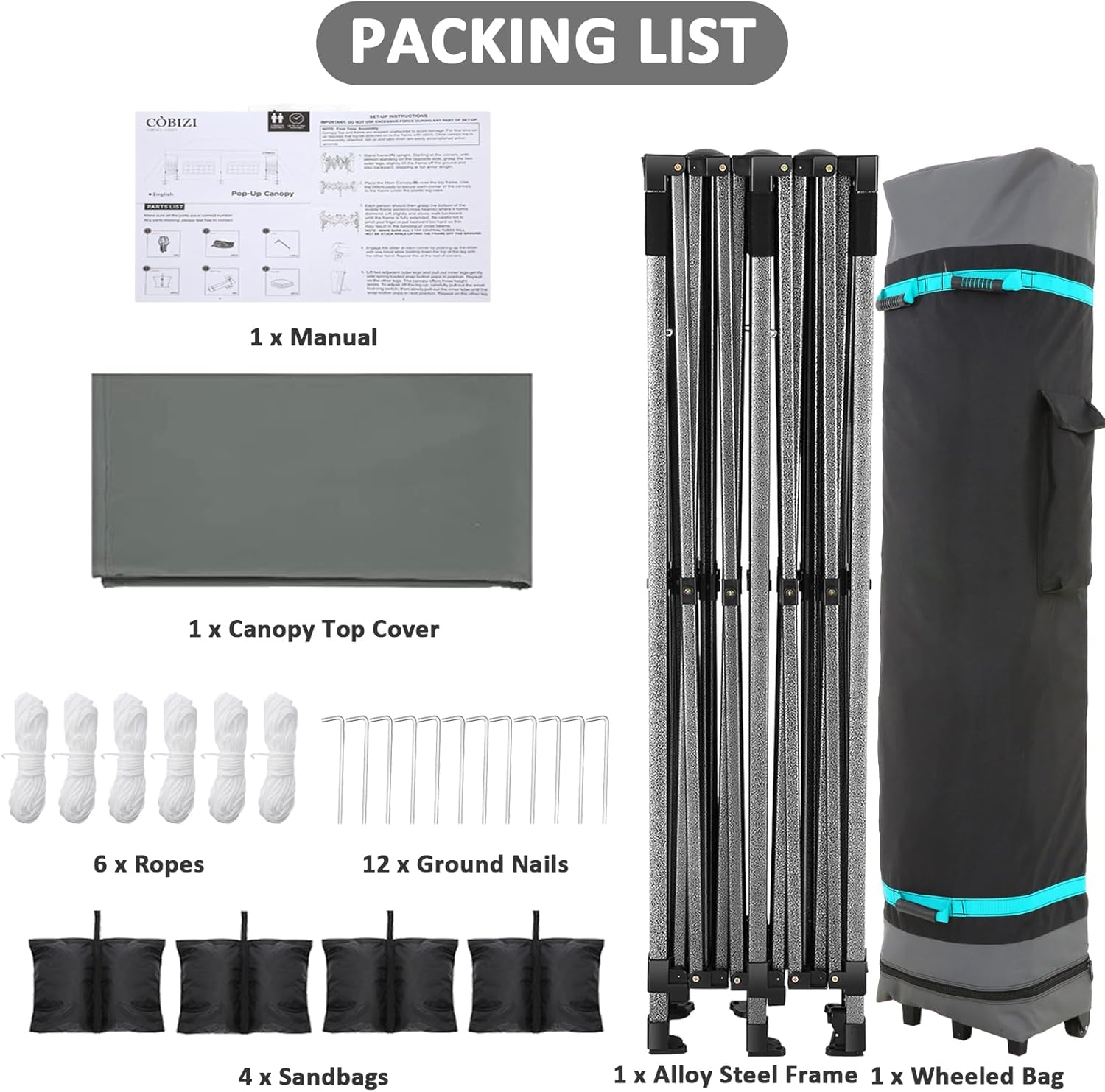- 【200 SQ Feet Shade Area】COBIZI 10x20 pop up tent provides 200 SQFT spacious covered space, it can easily accommodate 15-20 people, meet your different needs for holding large gatherings. Perfect for wedding, birthday party, market event and other larger events. When in use, always secure the 10x20 pop up tent with the included stakes and ropes to avoid damage. One year after-sale protection for canopy frame; Six months after-sale protection for fabrics and accessories.