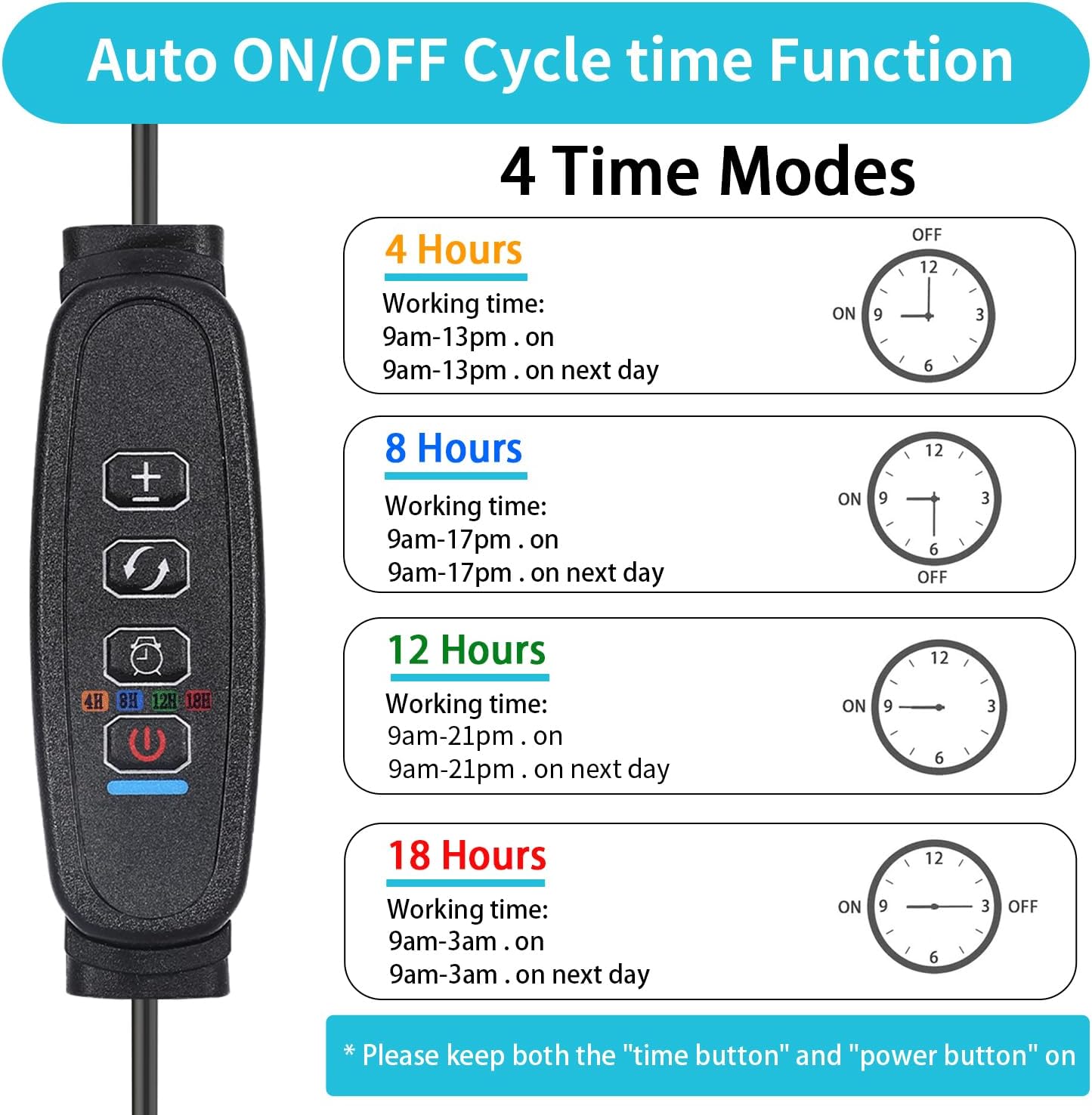 - 【Auto On/Off Timing Function】The plant grow light comes with a cycle memory timer function, which can Auto turn on/off every day according to your settings: 4/8/12/18 hours, the grow light will Auto turn on and off at the same time the next day, no manual operation is required, you can take care of your plants when you on work or vacation.