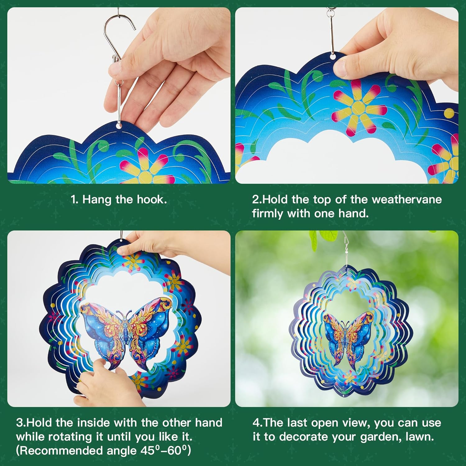 - Easy to Use: The initial state of this garden wind vane is flat. Just follow the instructions to turn it into a wonderful 3D sculpture decoration. The method is as follows: Hang the hook and hold the top of the wind spinners firmly with one hand while rotating it with the other until you reach your desired angle (suggested angle: 45–60°).