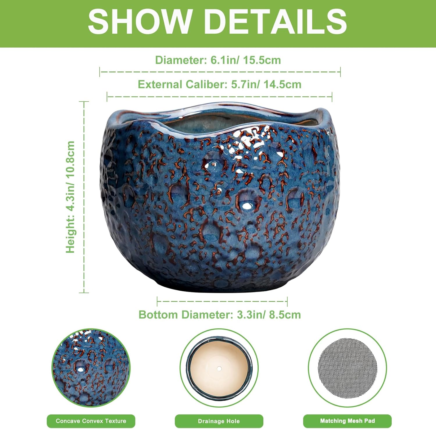 - Dimensions: The waist diameter of this ceramic plant pot is 6.1"/ 15.5cm, the external caliber is 5.7"/ 14.5cm, the height is 4.3"/ 10.8cm, the bottom diameter is 3.3"/ 8.5cm