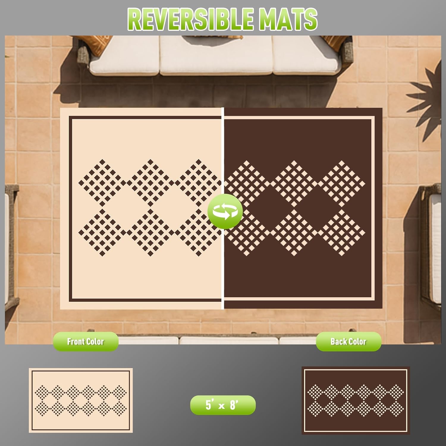 - Reversible Design: This double-sided patio rug features beautiful patterns on both sides, allowing you to quickly flip it over and instantly refresh your patio, porch, backyard, deck, RV campsite, or any outdoor space. A simple way to transform your style effortlessly