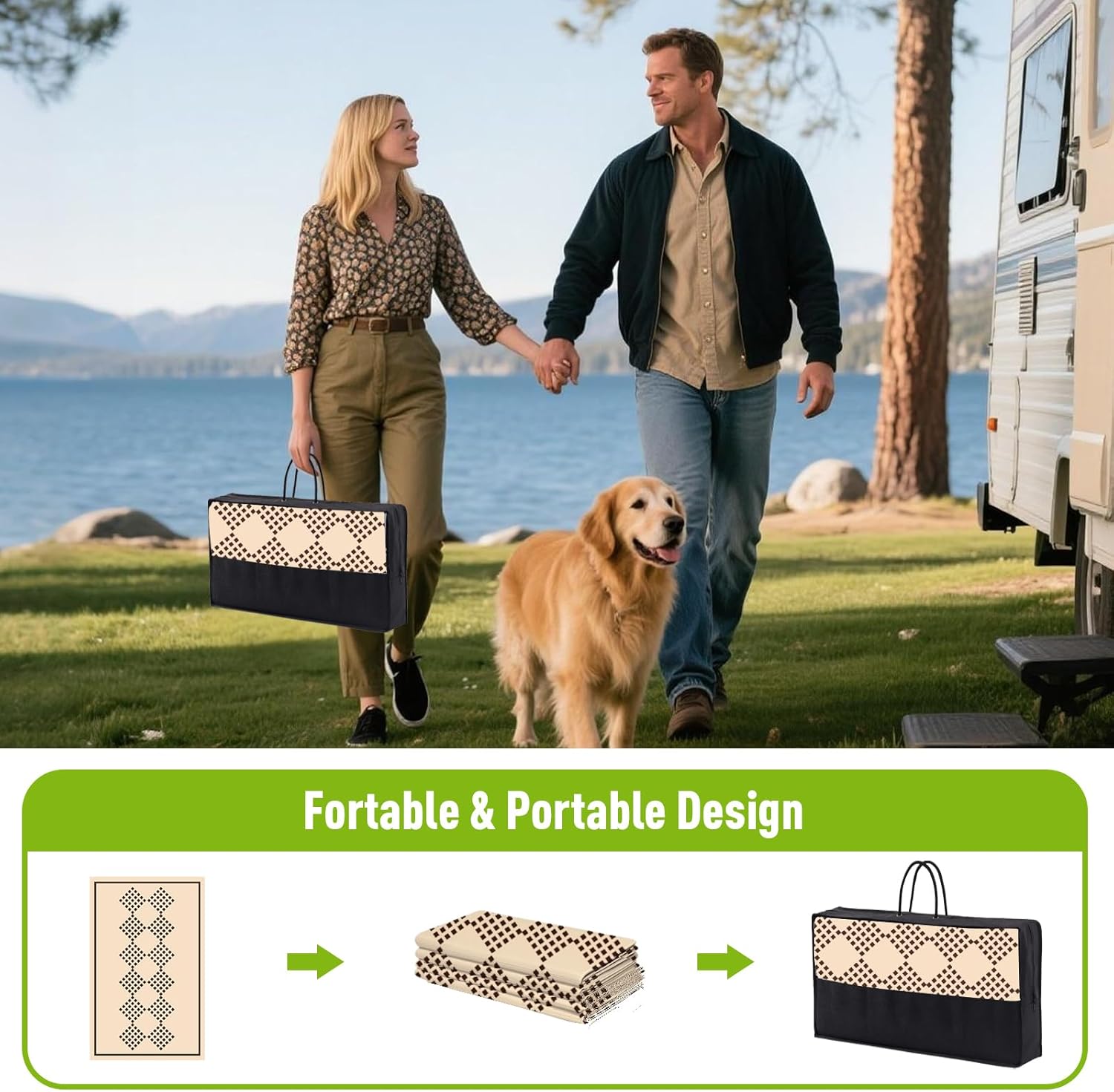 - Portable & Durable: This outdoor plastic rug with seams can be rolled or folded into a compact size and comes with a carrying bag for easy portability. Perfect for outdoor activities, picnics, sunbathing, and RV road trips. The heat-sealed edges prevent wear and tear, withstanding any environment, traffic, or scratches