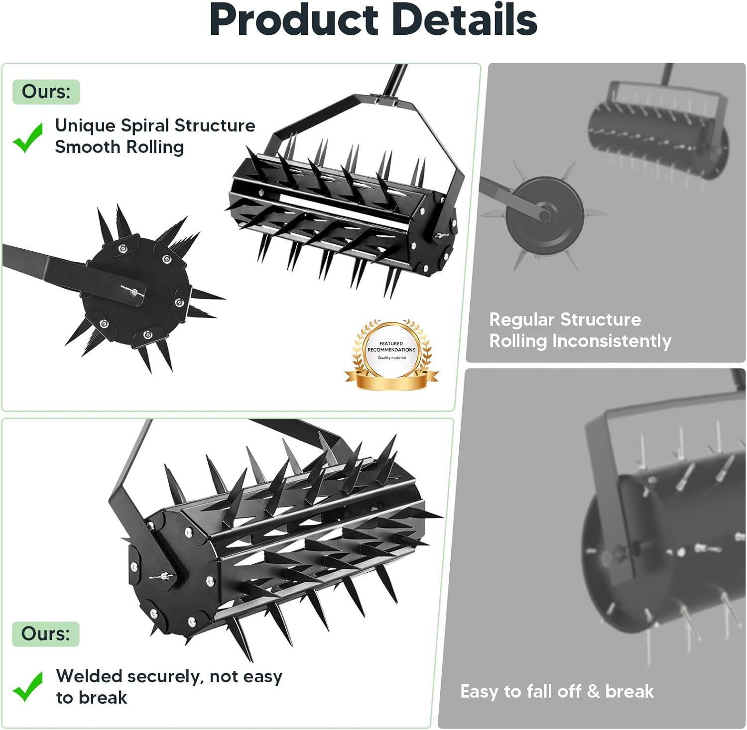 - Strong Penetration Power: The push spike aerator teeth are made of high-quality steel material, featuring 39 specially treated 2-inch high-hardness teeth. The sharp steel teeth are resistant to deformation, providing strong soil penetration power, and roll smoothly and continuously during use. The ingenious design significantly improves work efficiency, and the product's coated surface is treated to extend durability