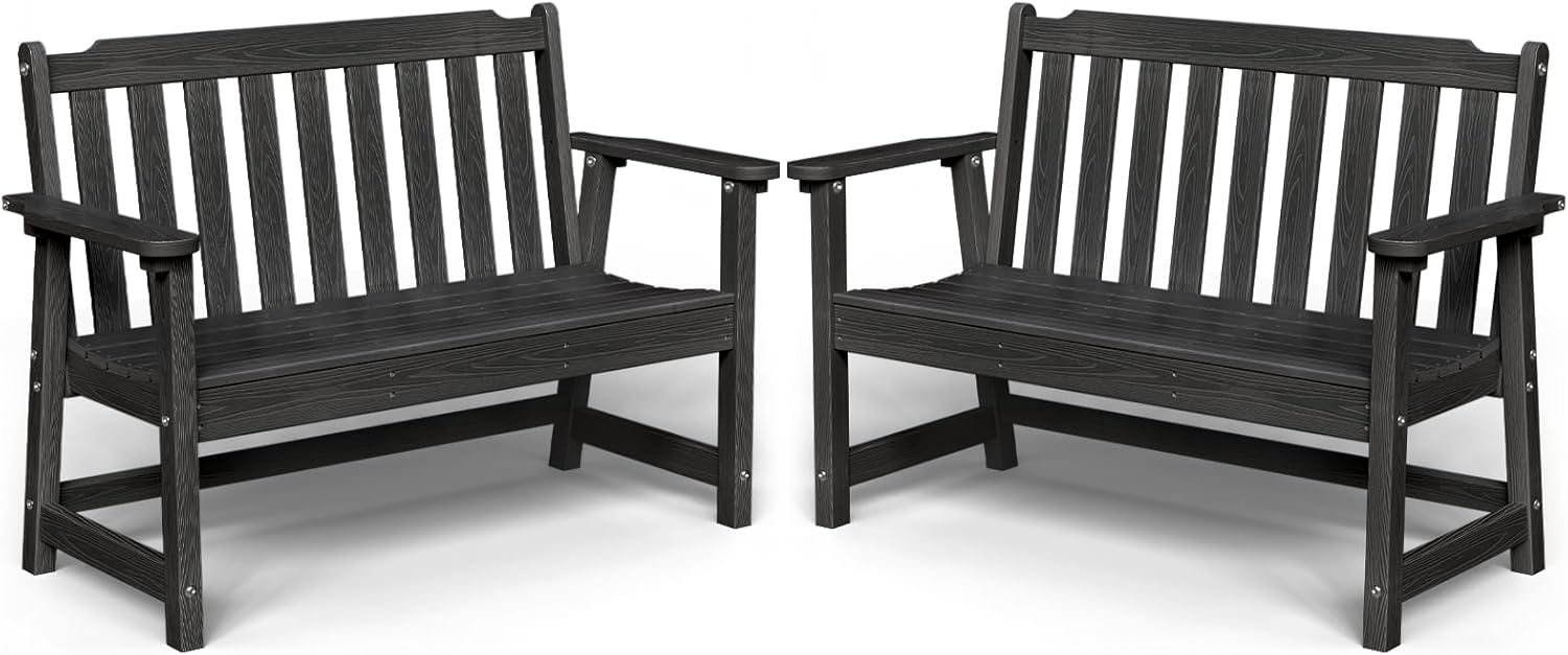 Outdoor Bench, 2-Person HDPE Garden Bench, All Weather Poly Patio Bench for Outdoors, Garden, Backyard, Porch and Park, 660 lbs Weight Capacity, Black, 2 Pack
