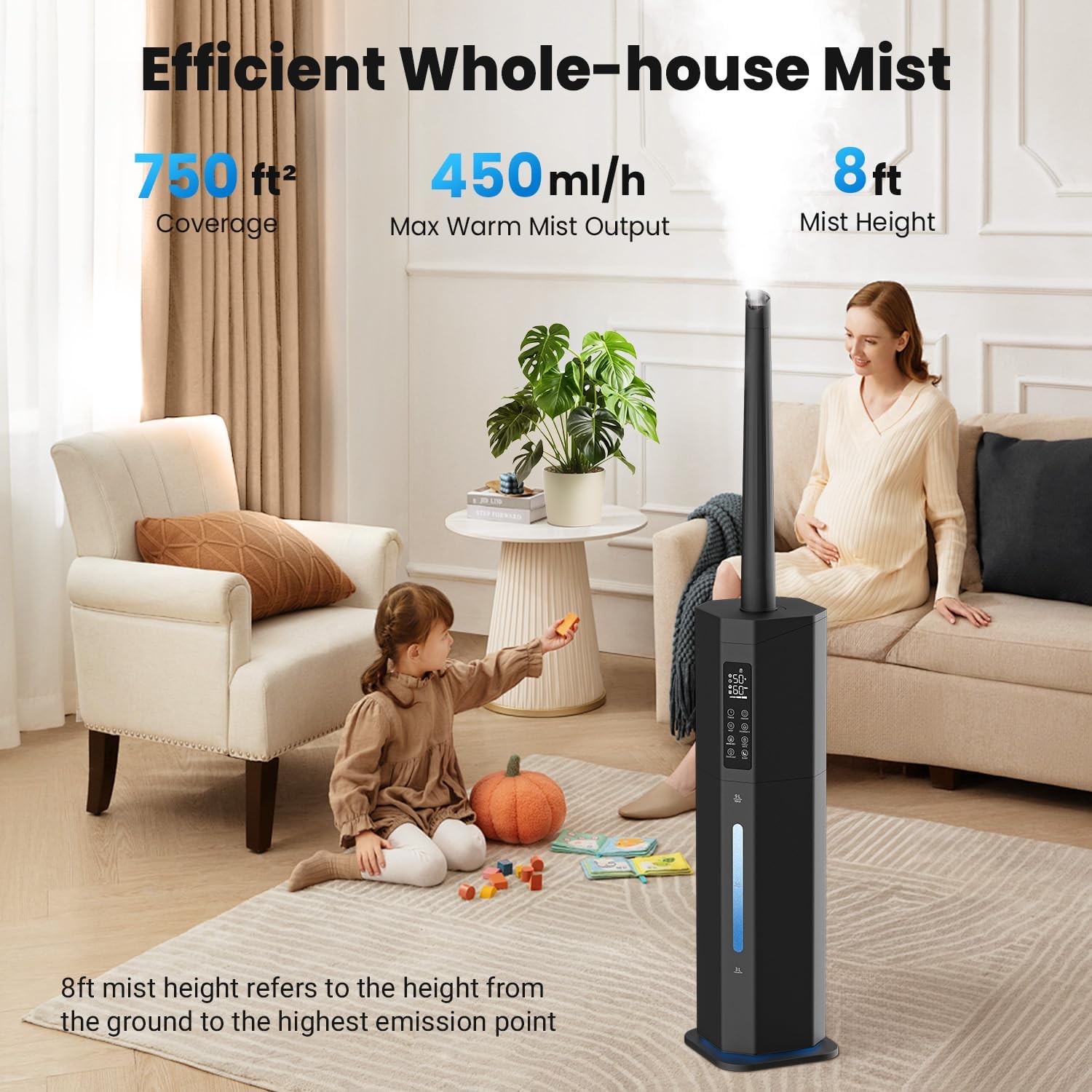 - 𝑺𝒎𝒂𝒓𝒕 𝑯𝒖𝒎𝒊𝒅𝒊𝒕𝒚 𝑪𝒐𝒏𝒕𝒓𝒐𝒍 & 𝑺𝒖𝒓𝒇𝒂𝒄𝒆-𝑺𝒂𝒇𝒆 𝑫𝒆𝒔𝒊𝒈𝒏: With the built-in humidistat, you’re able to set your ideal humidity (45%–95%) in one tap. The HUMIDITY mode maintains your target level and shuts off automatically. The 18-inch extension tube + 360° nozzle ensure a 8-feet mist prevent surface dampness—keeping floors and furniture protected