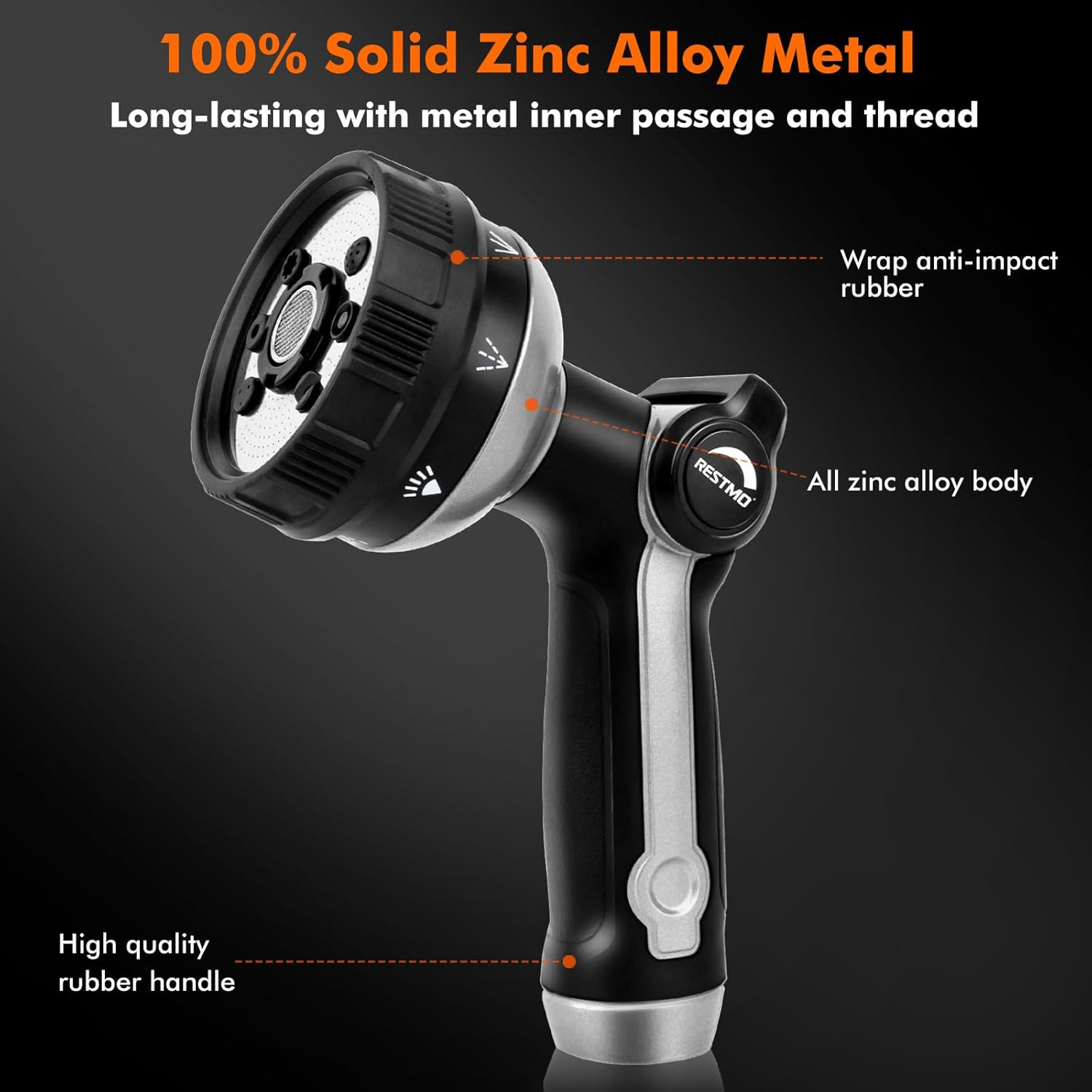 - Heavy Duty Metal Hose Nozzle: Constructed with premium zinc-alloy material, this hose nozzle sprayer is solid & strong to resist daily drops and shocks. The bronze powder painting, TPU coating and rubberized bezel dial can enhance durability & flexibility and withstand hard impacts & heavy force. A long-lasting garden hose nozzle you can count on many years.