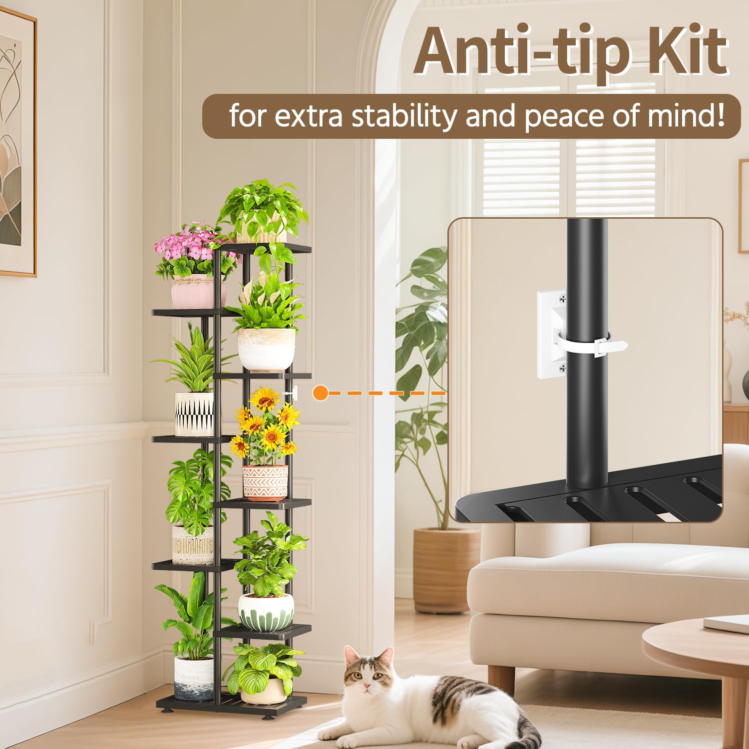 LASZOLA 7 Tier Plant Stand Indoors Outdoors for Large Heavy Duty Planter, Black Metal Tall Flower Holder Rack with Multiple Shelf for Modern Patio Corner, Vertical Organizer, Weather Resistant Bracket