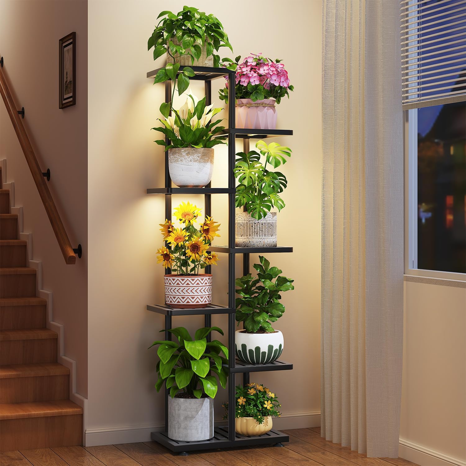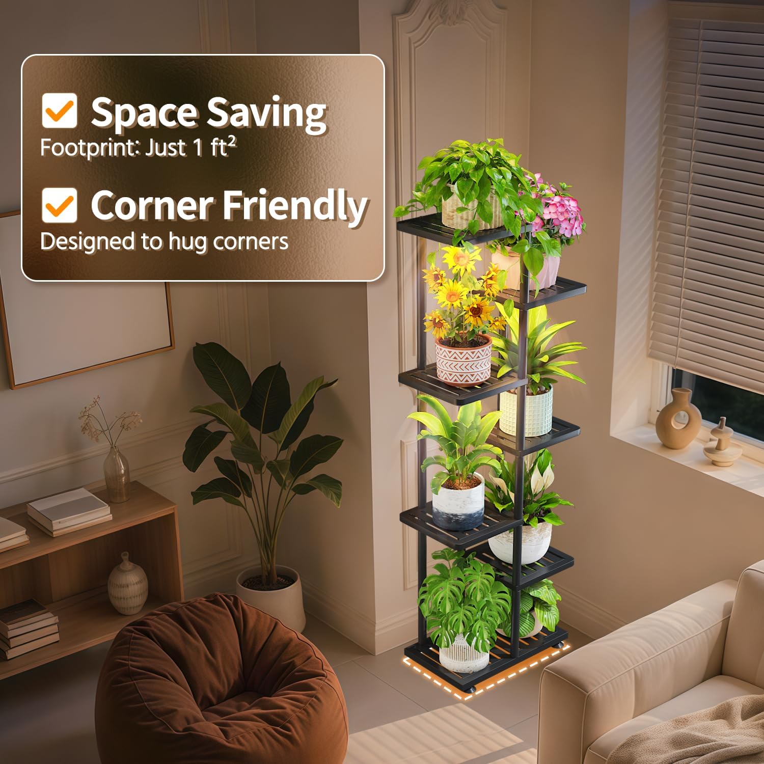LASZOLA 6 Tier Plant Stand Indoors Outdoors with Light for Large Heavy Duty Planter, Black Metal Tall Flower Holder Rack for Modern House Corner, Vertical Iron Organizer with Multiple Rustic Shelf