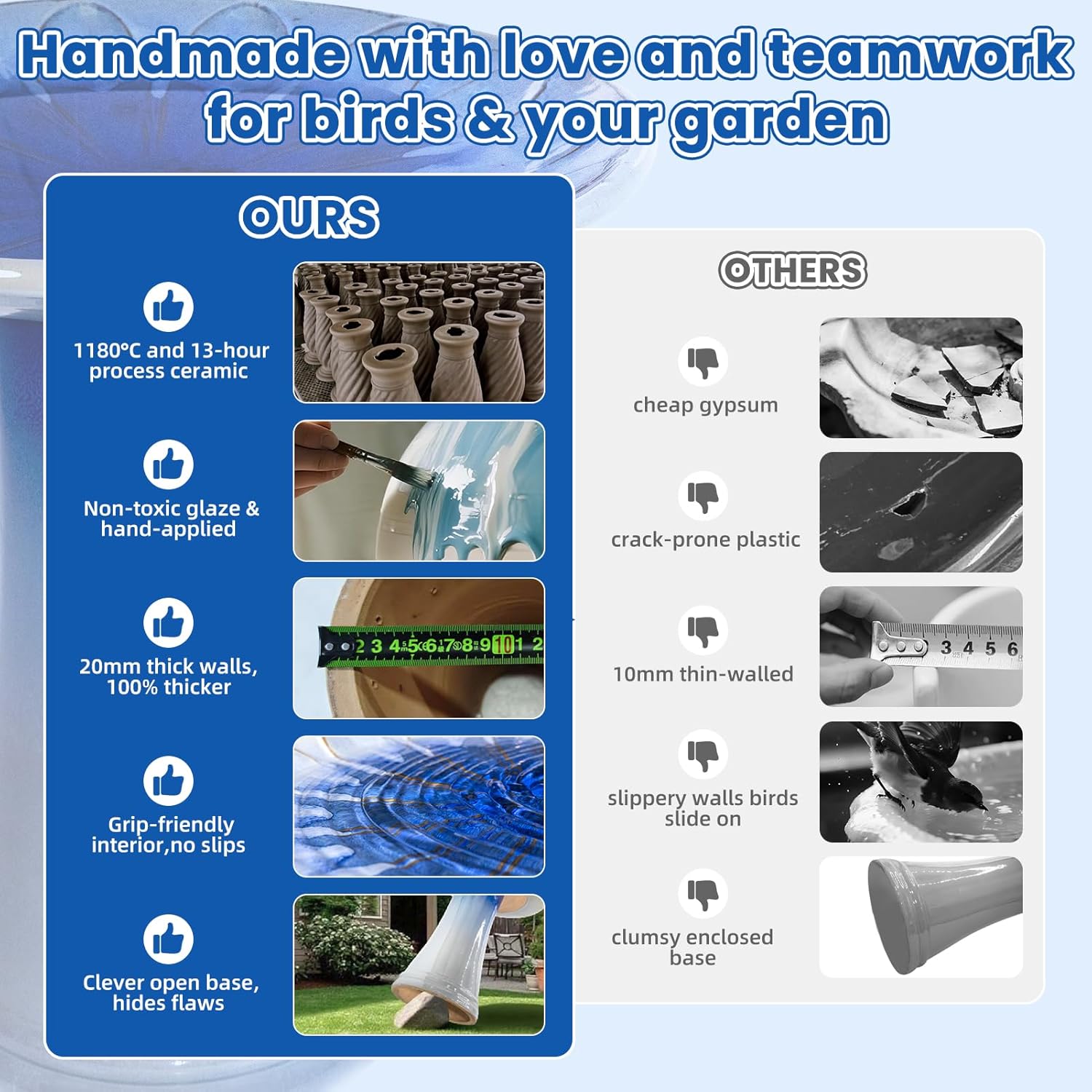 Ceramic Bird Bath for Outdoors – 18" H Birdbath Tool-Free Assembly, Hand-Glazed Earthenware with Non-Slip Bowl, Weather-Proof Sturdy Pedestal Design, Garden Decor (Blue)
