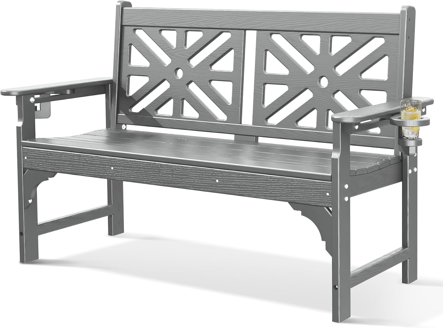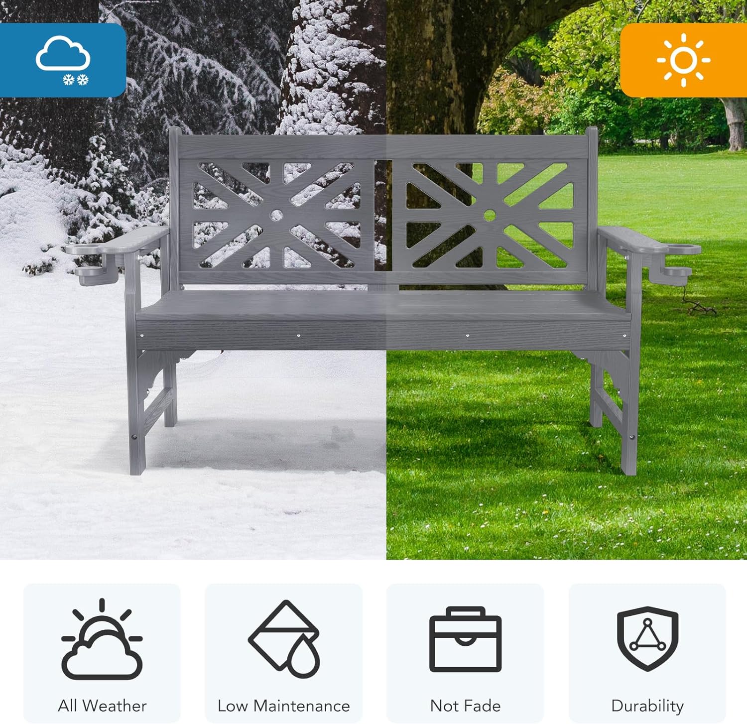 Oversized Outdoor Bench with Cup Holders, 51.5” HDPE Aesthetic Garden Bench for 2 Person, Memorial Benches - Easy Assembly & All Weather, for Porch & Patio, 800lbs Load Capacity (Grey, 1pc)