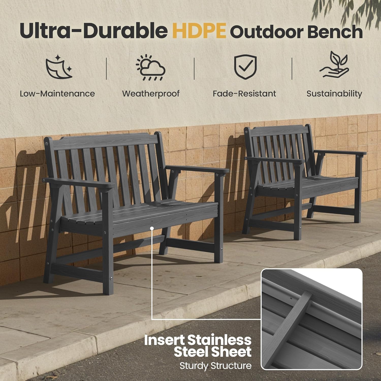 Ciokea 46" Heavy Duty Outdoor Bench Set of 2, HDPE Weatherproof Garden Bench, 2-Person Memorial Benches with 660 Lbs, Waterproof Patio Porch Benches for Outside Business Office Backyard, Dark Grey