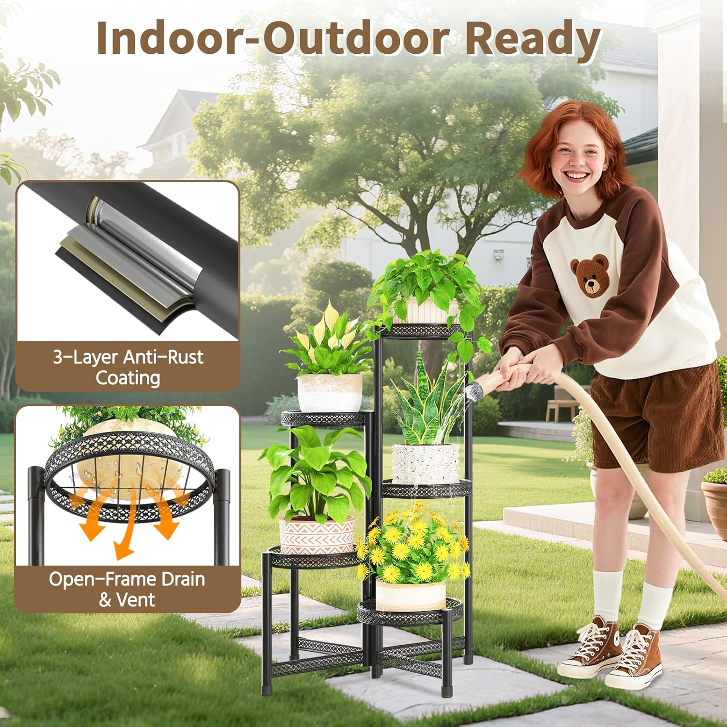 - 【Built to Last】Our metal plant stand is designed with longevity in mind. It features a rust-proof coating that withstands sun, rain, and daily watering—no rust, no worries. The smooth surface is easy to clean—just wipe up spills with a damp cloth and it looks brand new.