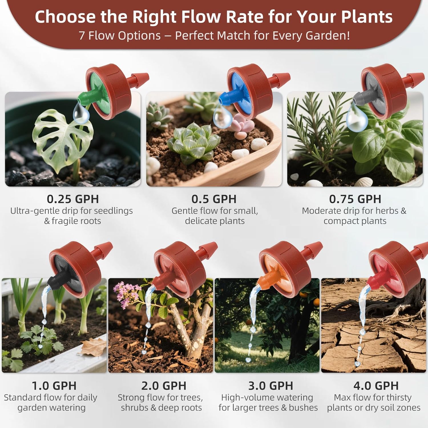 - Custom Flow Rates for Every Plant Type: Available in 0.25 GPH, 0.5 GPH, 0.75 GPH, 1 GPH, 2 GPH, 3 GPH and 4 GPH options. Choose low flow for delicate flowers, medium for vegetables, and higher flow for trees or shrubs. Optimize water delivery to each plantâs unique needs. !!! CHOOSE pressure-compensating drip irrigation emitters FROM ăSpalolenă!!!