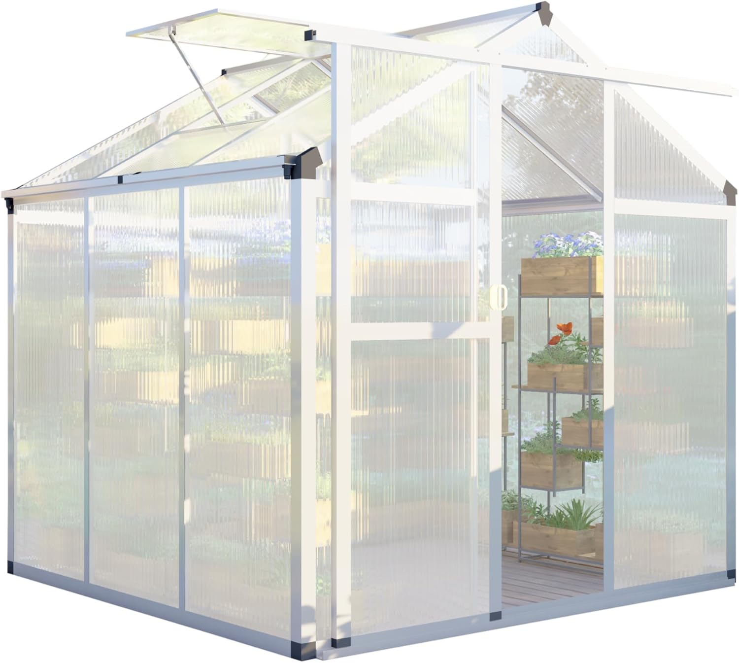 - ALL-SEASON PROTECTION: Built to endure heavy rain, intense sun, and varying climates, the greenhouse ensures your plants are shielded throughout the seasons. Its polycarbonate panels also provide excellent electrical insulation, contributing to a safe and healthy growing environment.