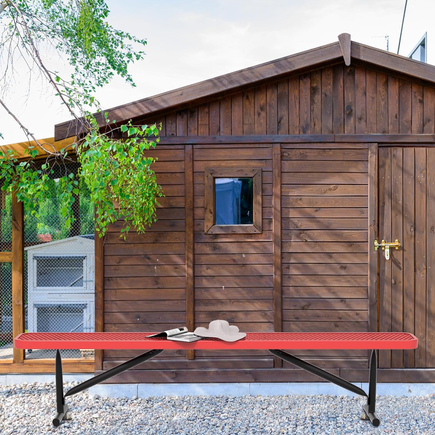 8 Feet Heavy Duty Metal Park Bench for Outside, Outdoor Bench with Portable Frame, Commercial Benches for Shopping Mall, Store, Park, Patio, Deck, Red
