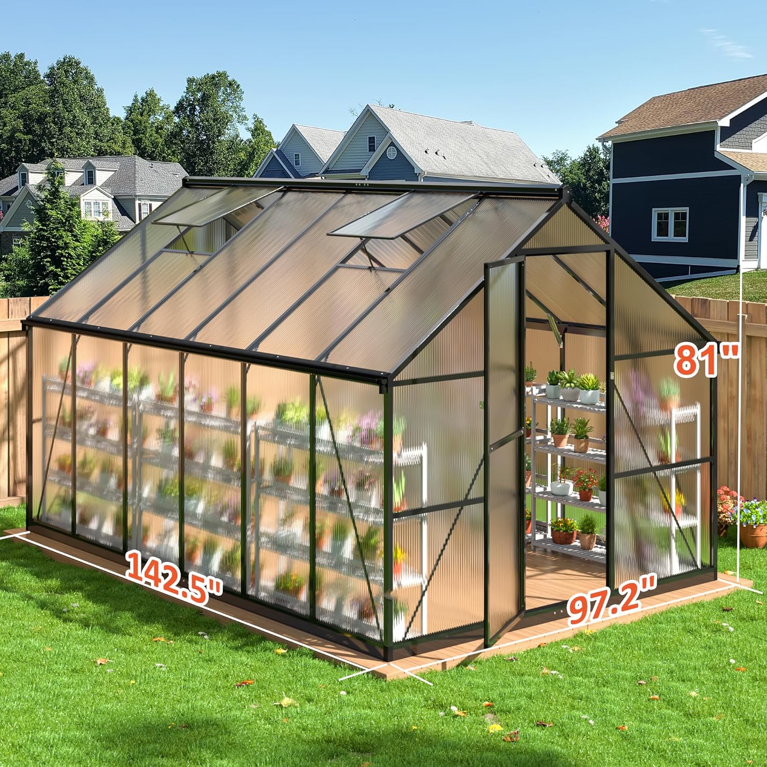 8×12 FT Greenhouse for Outdoors, Quick Setup Polycarbonate Greenhouse with Roof Vent, Walk in Green Houses for Outside for Outdoor Garden Backyard, Black