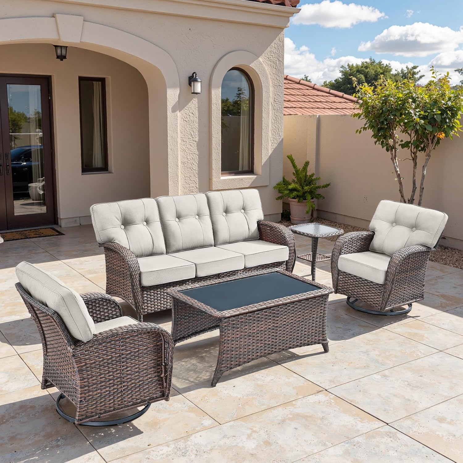 - 【Balcony Furniture Set Includes】: The 5-piece balcony furniture set includes 2 swivel chairs, 1 glass coffee table, 1 side table, and 1 sofa. The footstool can be used not only for relaxing your legs but also as a small table or stool. The swivel chairs can support up to 350 pounds.