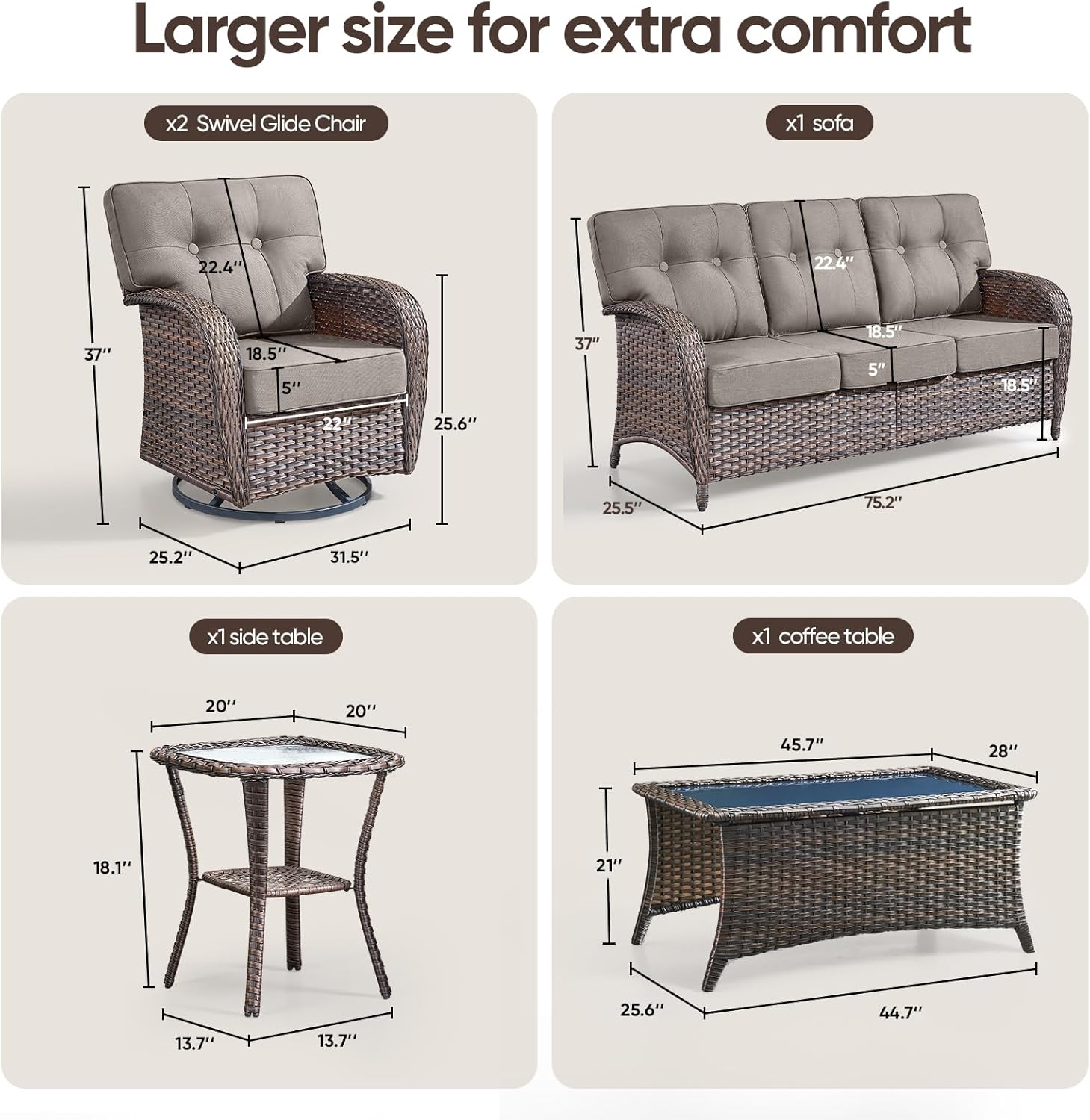- 【Balcony Furniture Set Includes】: The 5-piece balcony furniture set includes 2 swivel chairs, 1 glass coffee table, 1 side table, and 1 sofa. The footstool can be used not only for relaxing your legs but also as a small table or stool. The swivel chairs can support up to 350 pounds.
