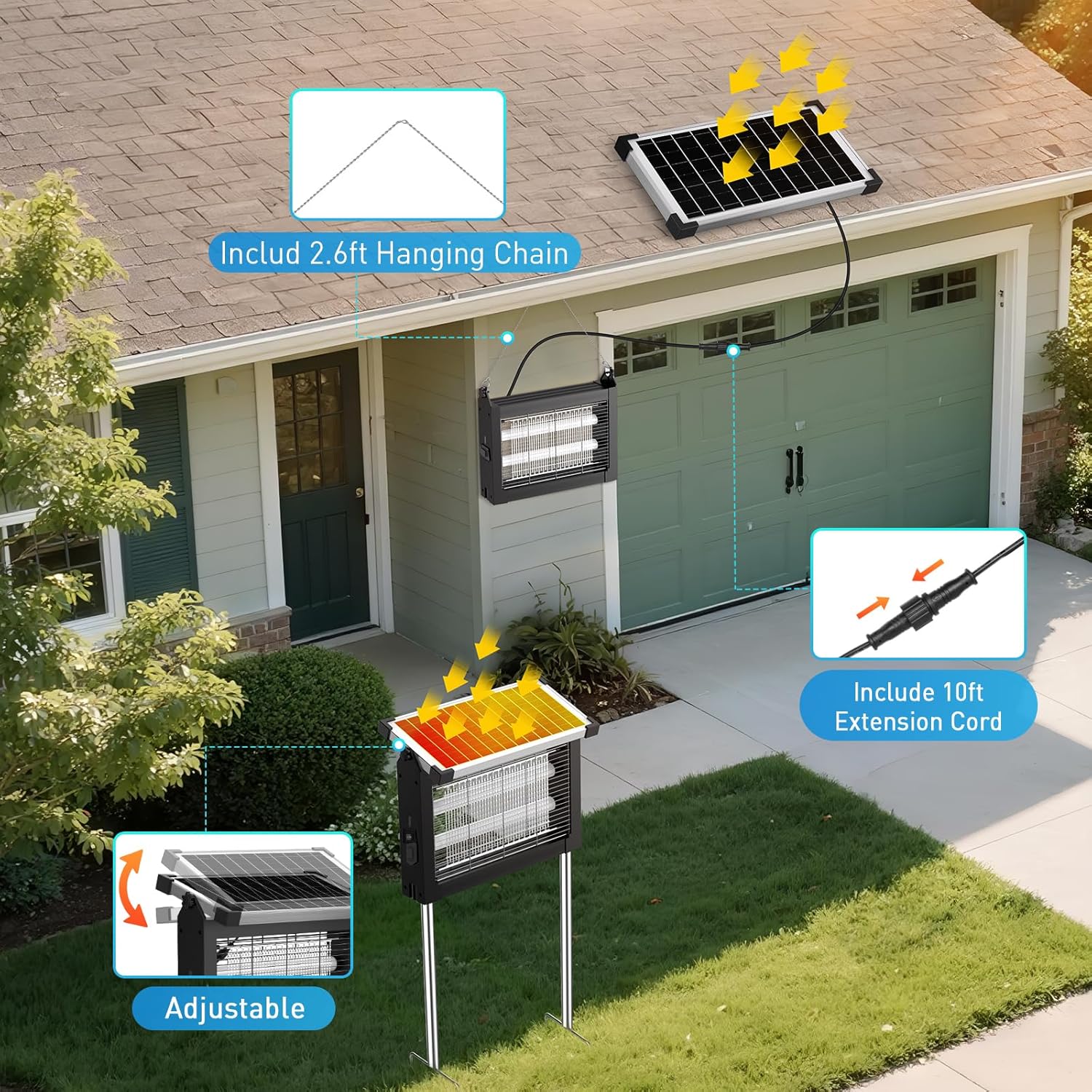 - [4500V High Voltage Power Grid] Increases mosquito catching efficiency by 65%; the 4500V power grid effectively eliminates pests. IP66 waterproof rating, rain and splashproof, perfect for patios and pools.