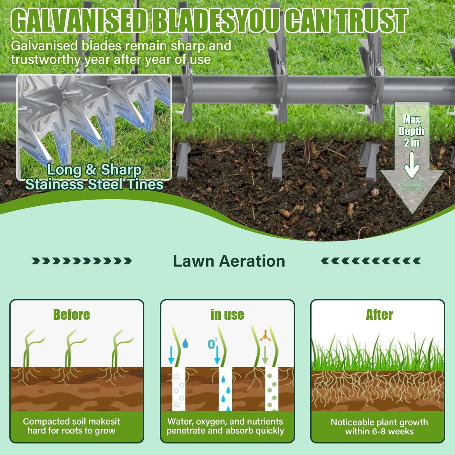 - 【QUICK ASSEMBLY & UNIVERSAL COMPATIBILITY】 – Includes clear instructions for easy setup—no tools needed. The 40-inch tow-behind aerator hooks up to any tractor brand in minutes, saving you time and effort.