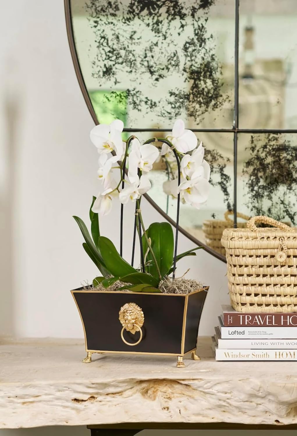 - Modern Statement Cachepot with Gold Detailing | Add power and poise to your space with this horizontal black metal cachepot from the Paws and Claws Collection. Featuring a hand-carved lion emblem, gold trim, and fluted sides, this black planter blends decorative detail with symbolic design.