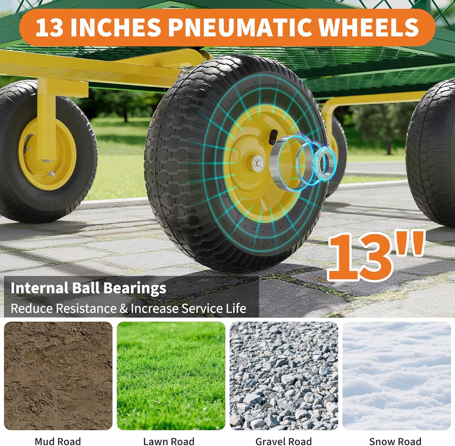- 【13-inch inflatable tires for smooth travel on multiple terrains】The garden cart on wheels is equipped with 13-inch large rubber tires and reinforced metal rims, offering excellent elasticity, impact resistance, and noise reduction. It easily handles complex terrains such as grass, mud, rocks, and snow, moving smoothly and significantly reducing transport resistance.