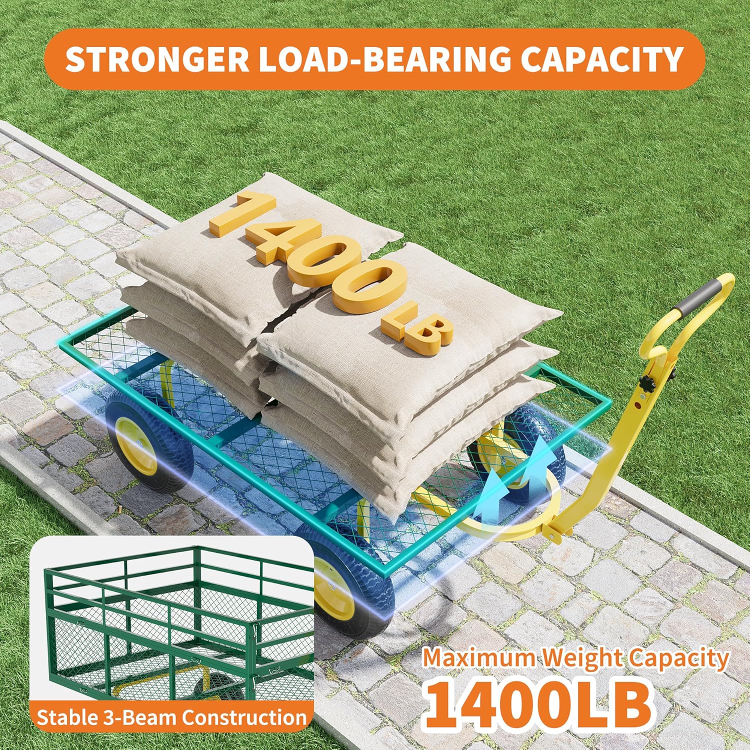 3-in-1 Heavy-Duty Steel Garden Cart, 1400 Lbs Garden Wagon, with 13 Inch All-Terrain Tires and Removable Mesh Side Panels, 180° Rotating Handle, Metal Multi-Function Carts, Outdoor Gardens Wagon Cart