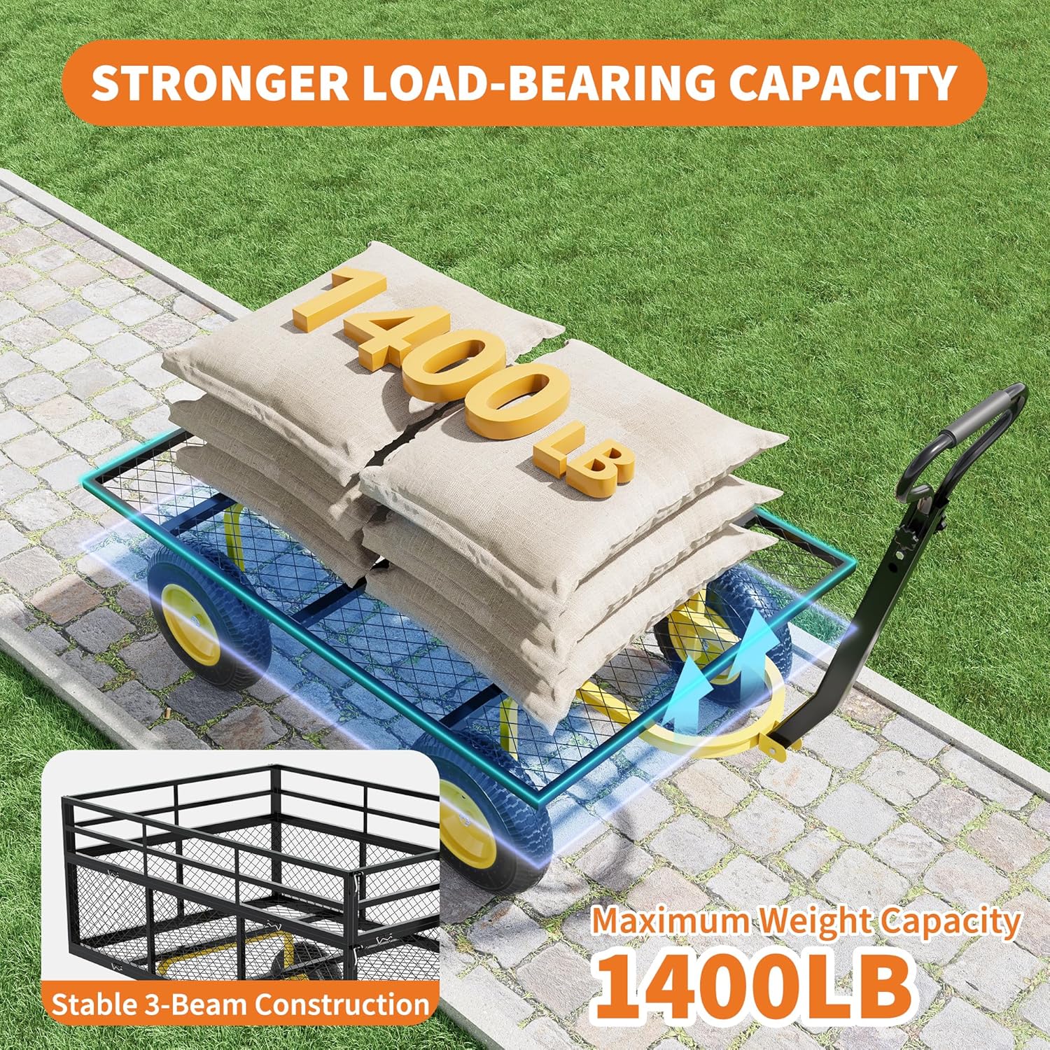 3-in-1 Heavy-Duty Steel Garden Cart, 1400 Lbs Garden Wagon, with 13 Inch All-Terrain Tires and Removable Mesh Side Panels, 180° Rotating Handle, Metal Multi-Function Carts, Outdoor Gardens Wagon Cart