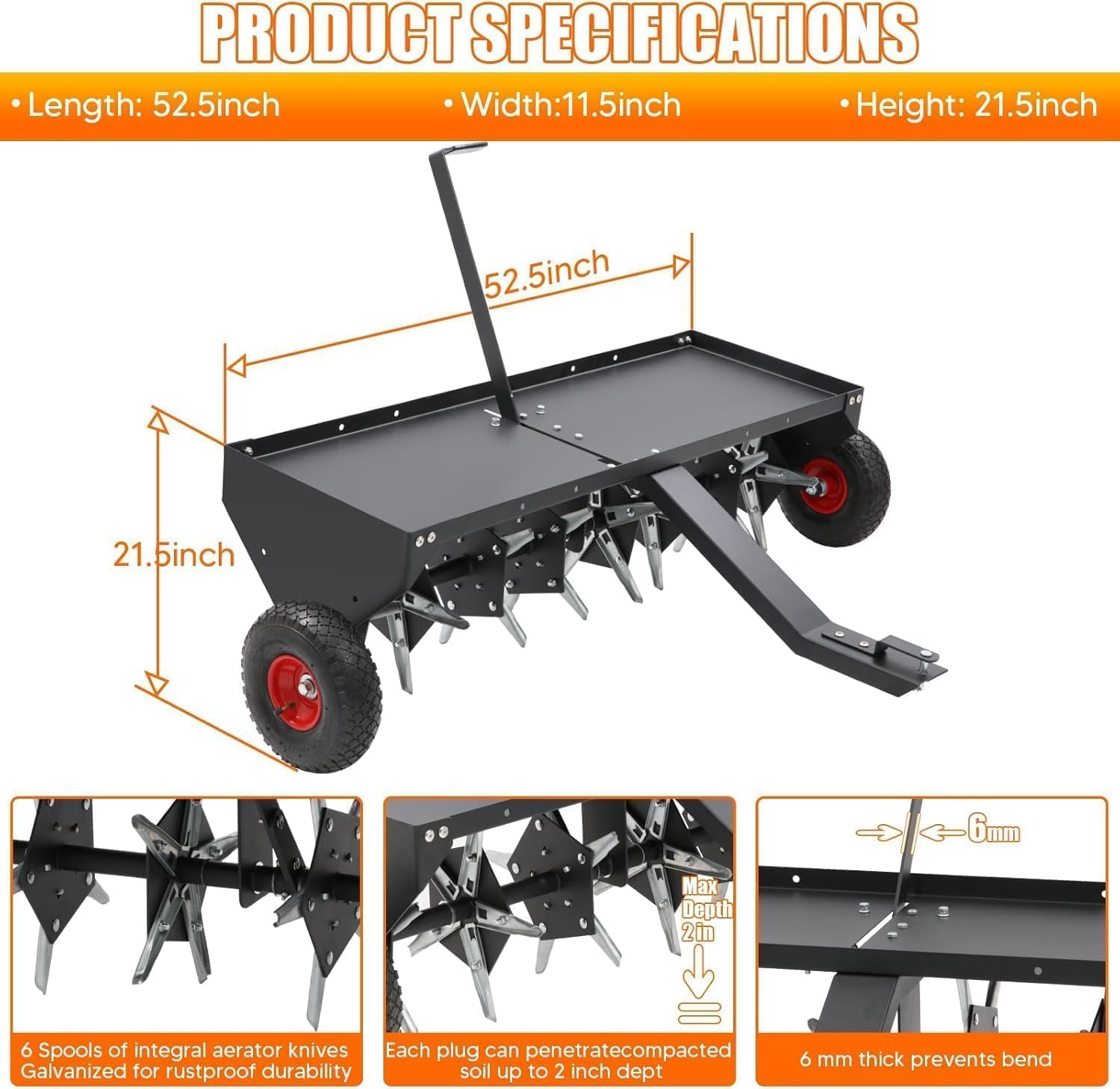 - 【Esay Transportation】-52-Inch Tow Behind Spike Aerator with two pneumatic tyres to ensure smooth transport,you can easy to use cantilevered transport handle for easy loading, unloading and loweringand with the control lever to easily cross driveways, pavements and other areas.
