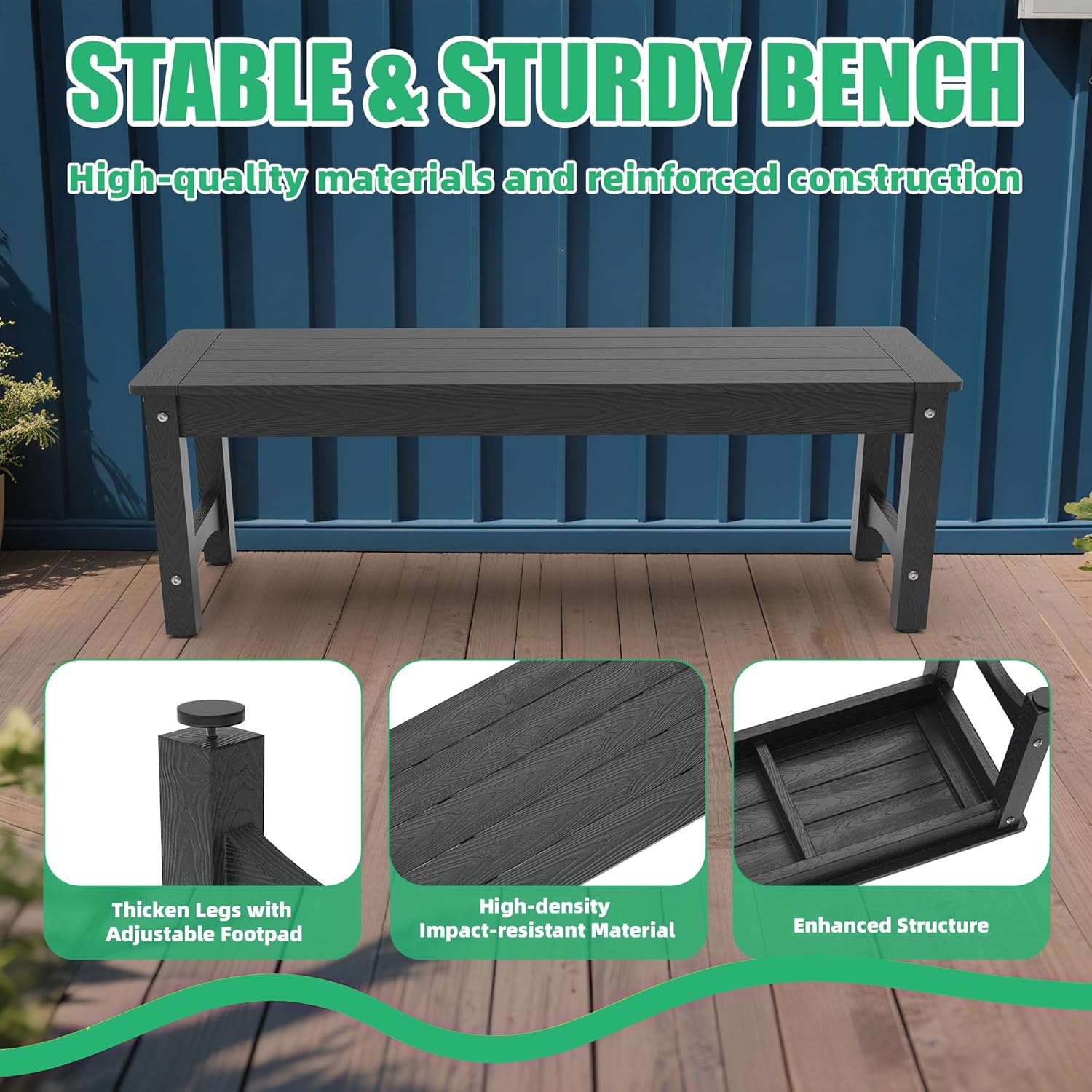- 【Capacity Up to 800 LBS】 The patio bench features a sturdy frame construction with reinforced seat panel beams and thickened legs for enhanced stability and durability. Non-slip foot pads at the bottom stabilize on grass, slate and wooden platforms.