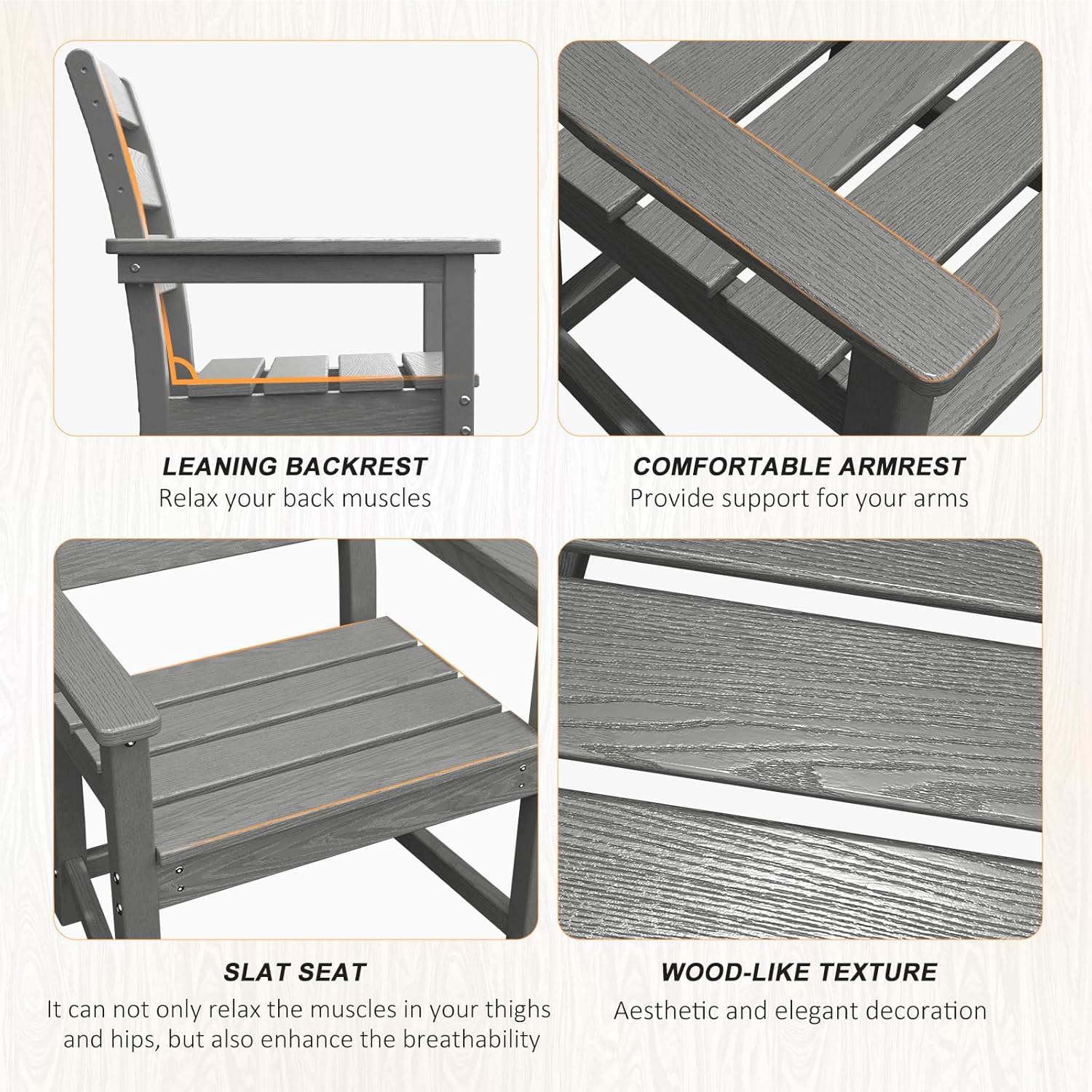 - ăAll-Weather MaterialăMade of High-density polyethylene (HDPE) and 304 stainless steel hardware, this patio dining set is long-lasting and will not crack, scratch, rust, or fade over time. In addition, the table and chairs are designed with an elegant wood-like texture, combining both practicality and aesthetics.