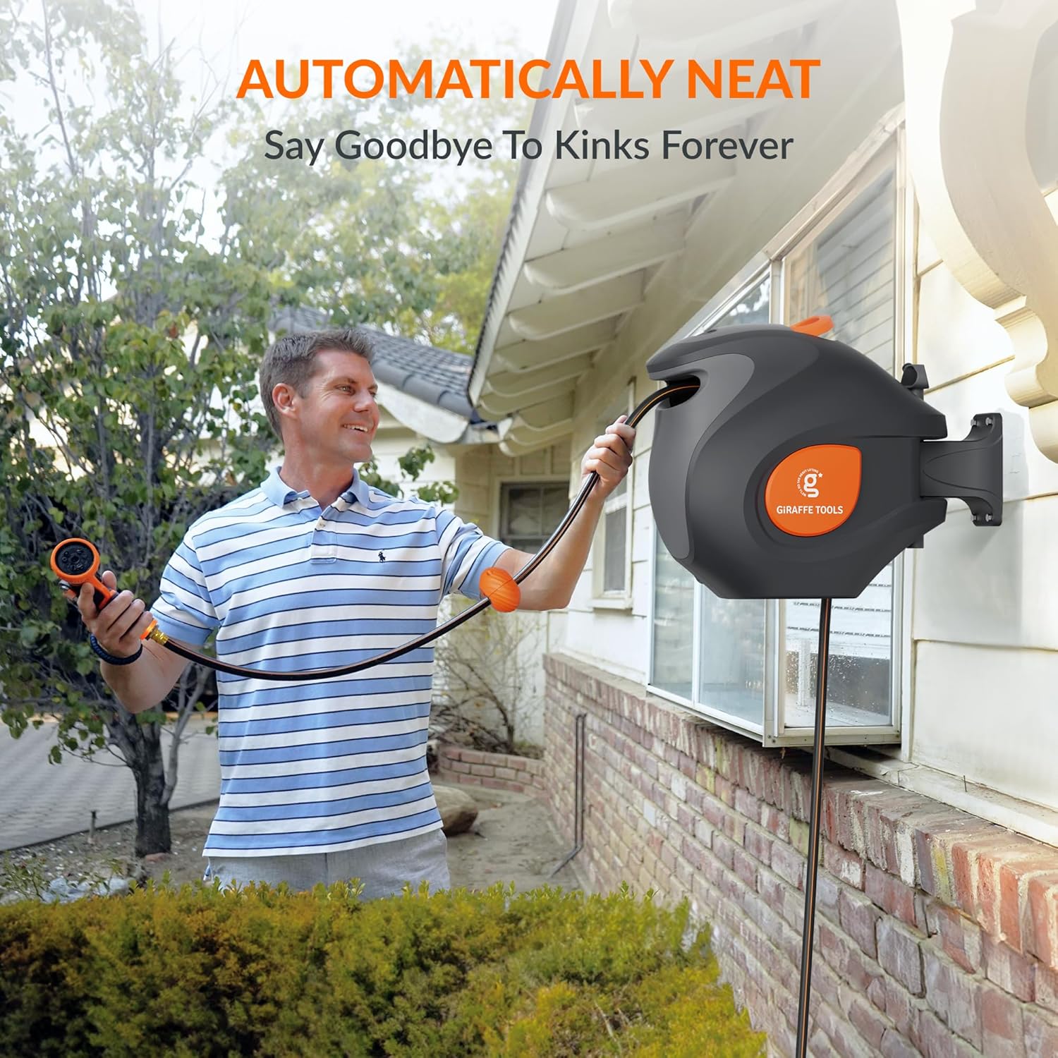 Giraffe Tools BW35 Retractable Garden Hose Reel | Wall-Mounted, Automatic Rewind, 100ft 1/2" Hose with 9-Pattern Spray Nozzle | Outdoor, Lawn, Garden & Car Cleaning Use