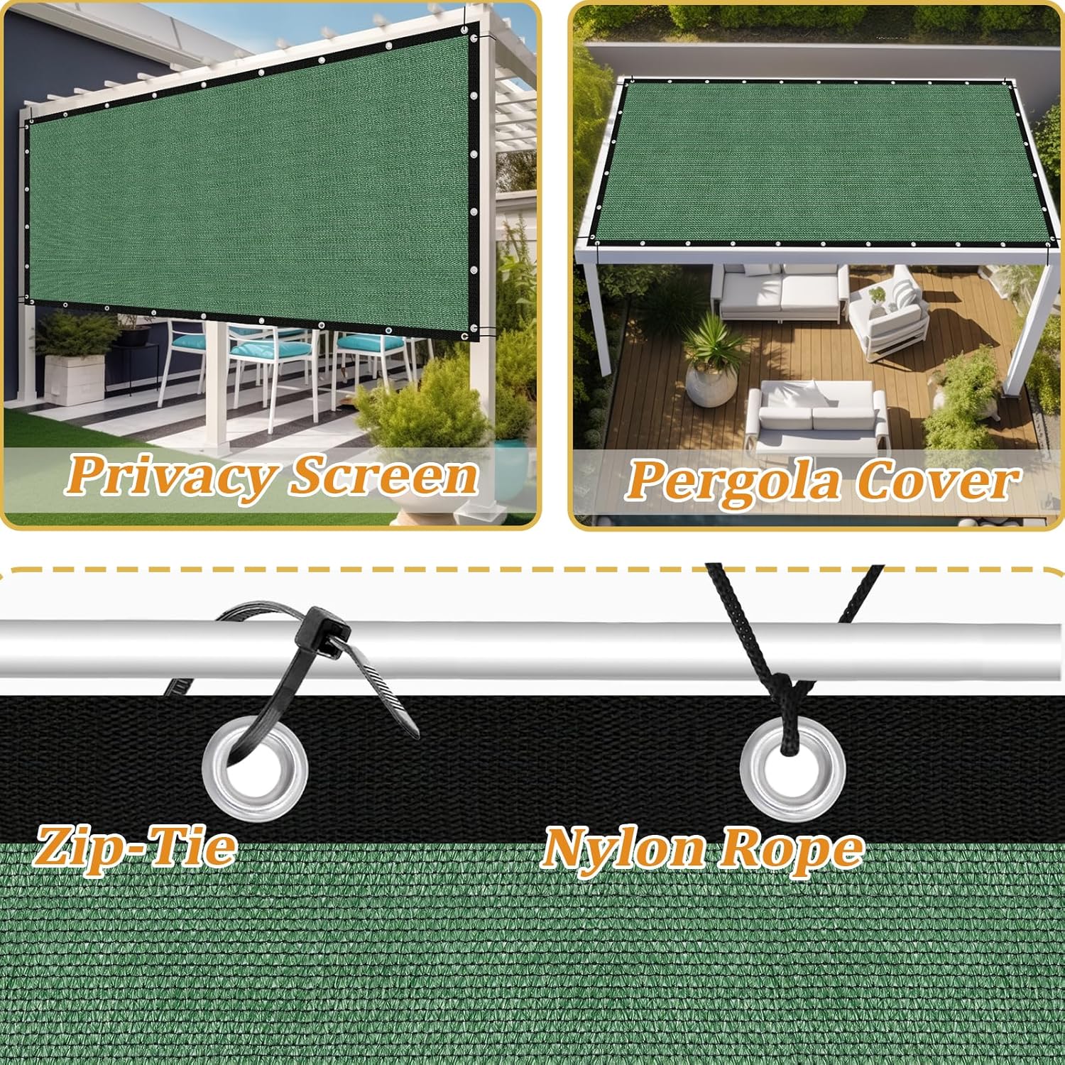 - [Easy to Install] With included grommets on each sides every 96 ft space and fixing accessories, you can easily attach the pergola shade cover to various structures while ensuring uniform stress. Whether you're looking to cover your backyard, carport, or playground, you can have it up and providing shade in no time.