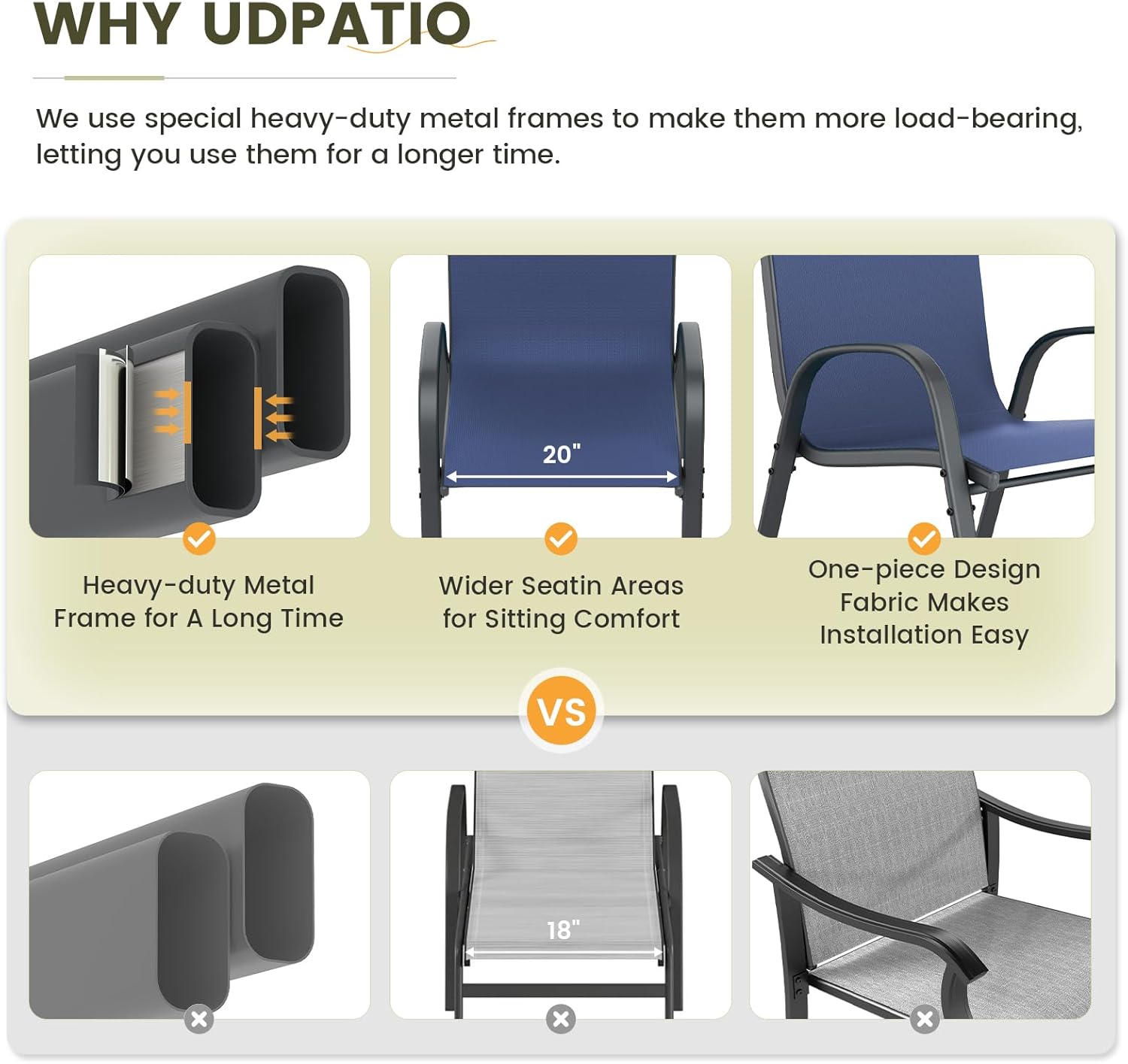- 【WIDER SEAT & HIGH BACK】Our patio dining chairs are 20 inches wider than traditional 18-inch seating. It also features an ergonomic high back structure. The comfortable width of the chair seat and the contoured backrest make your leisure time more comfortable