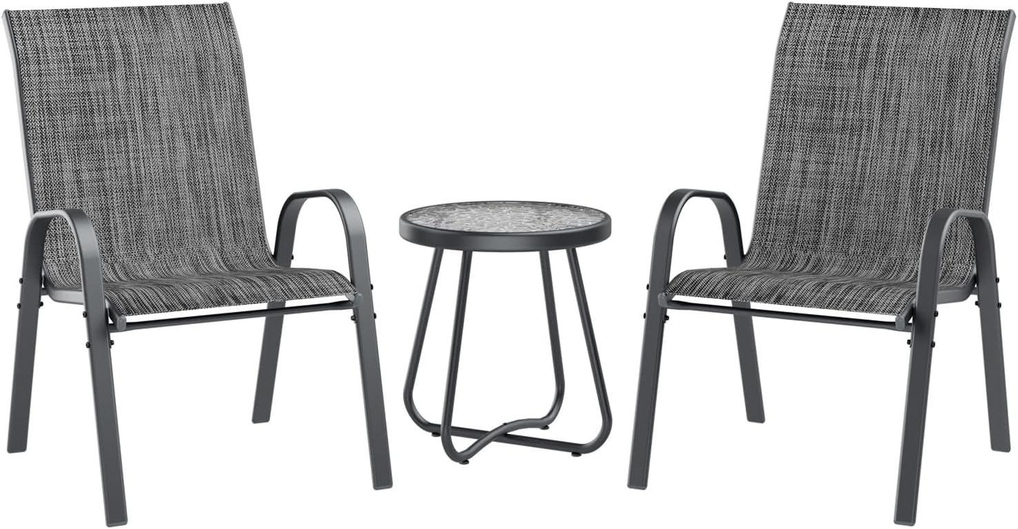 UDPATIO Patio Dining Set of 3, Outdoor Table and Chairs Set with Glass Table, 2 Stackable Patio Chairs with High Back, Outdoor Furniture Sets for Deck Garden Backyard Lawn Poolside (Dark Grey)