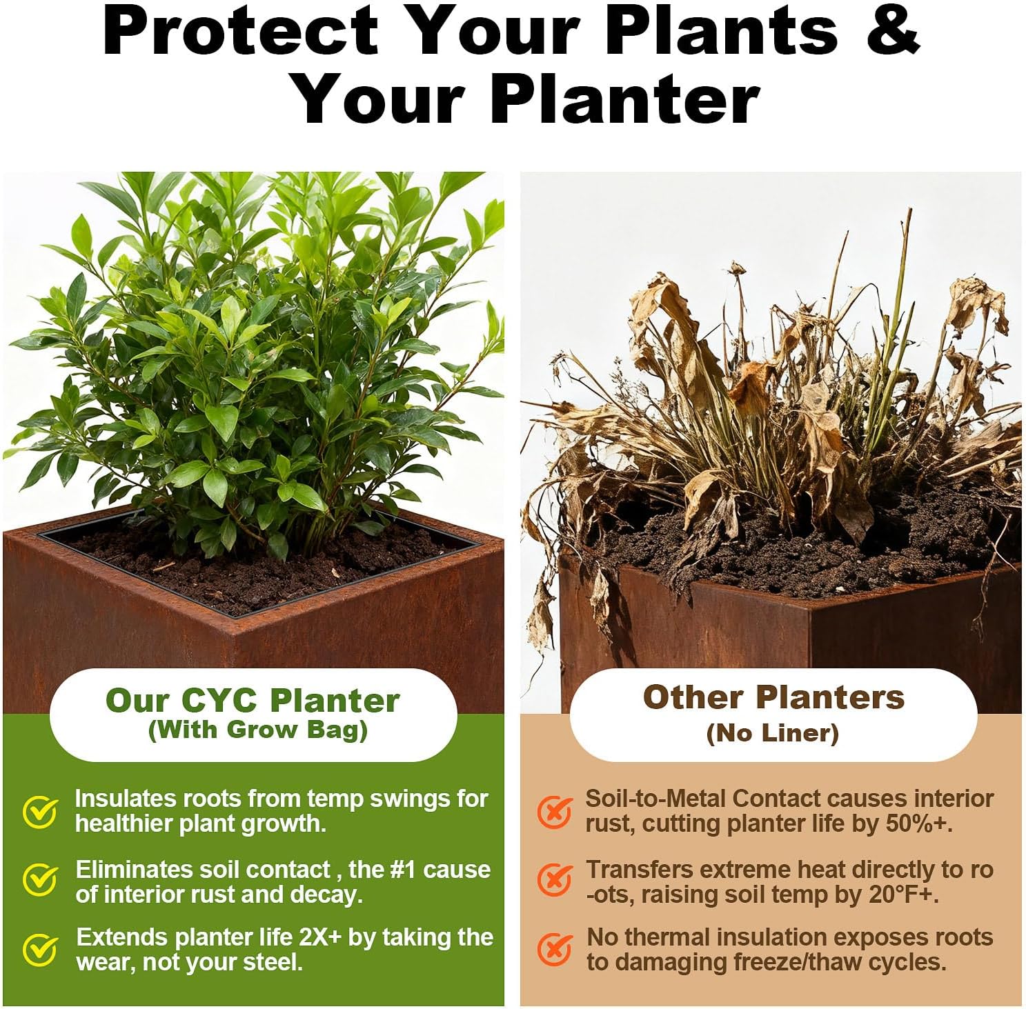 - All-Weather Root Protection: Included grow bag liner shields roots from extreme temperatures while preventing soil-metal contact to stop interior rust and extend your planter's life 2X longer
