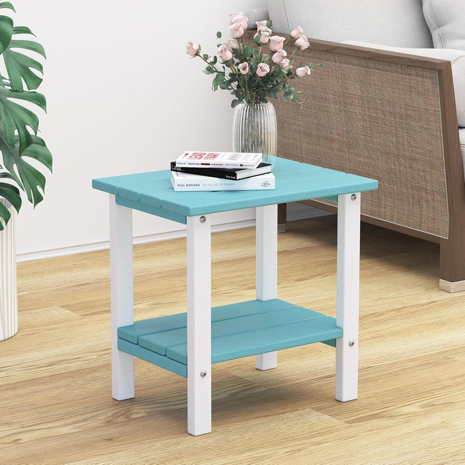 Outdoor Side Table, 16 Inch Square Patio Table, All Weather Porch Table for Balcony, Backyard, Lawn, Indoor Outdoor Companion (Aruba Blue & White)